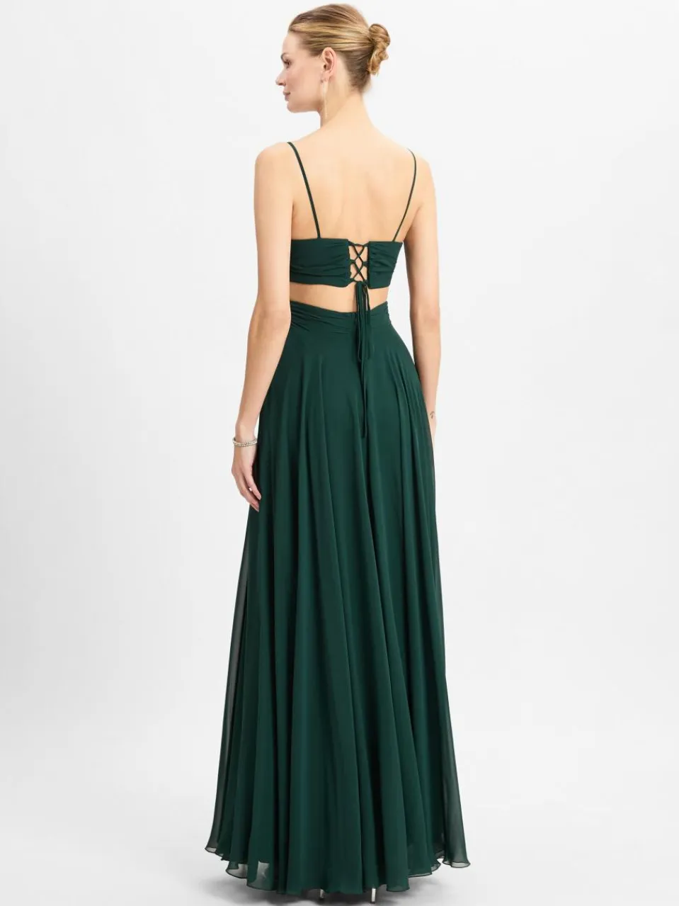 Stilvoll und elegant mit Twist: von vorne erscheint das Abendkleid von Marie Lund schlicht und klassisch – die rückseitige Schnürung ist ein wahrer moderner Hingucker.