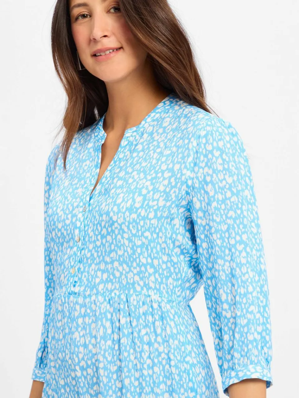 Das feminine Volantdesign wird unterstrichen von der fließend fallenden Viskose und dem modischen Alloverprint.