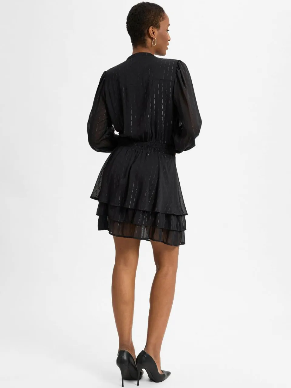 Das Kleid von Marie Lund besticht durch den leichten Stoff mit Glitzergarn und kleinen Details wie dem voluminösen Rockteil und dem tiefen V-Ausschnitt mit kleinem Stehkragen – ein perfektes Party-Outfit.