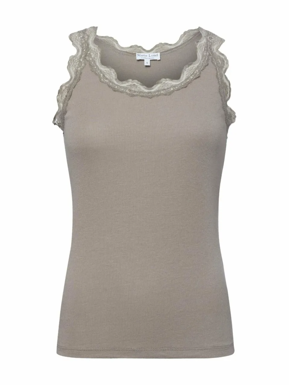 Mit Spitzendetails zeigt sich das Top von Marie Lund als raffinierter Allrounder – solo zu Jeans oder Jogpants oder unter dem Grobstrickpulli.