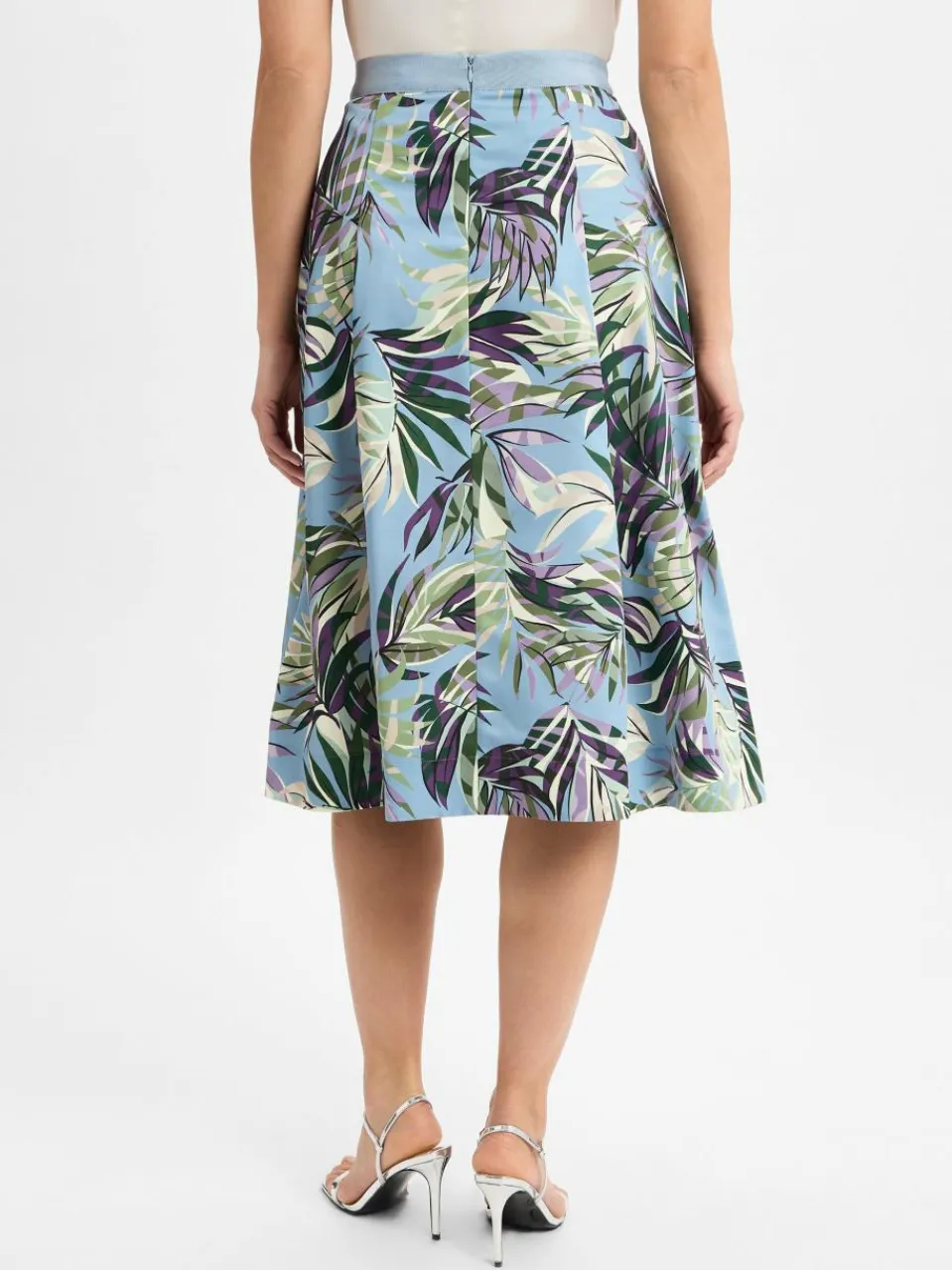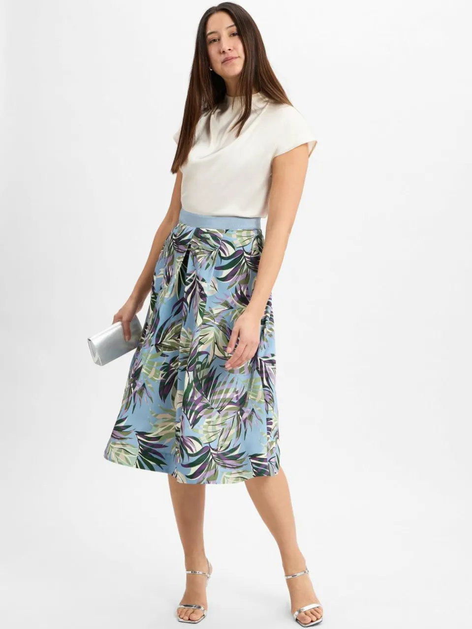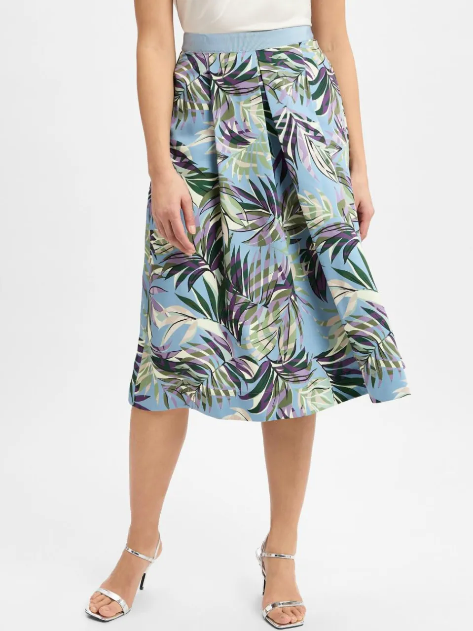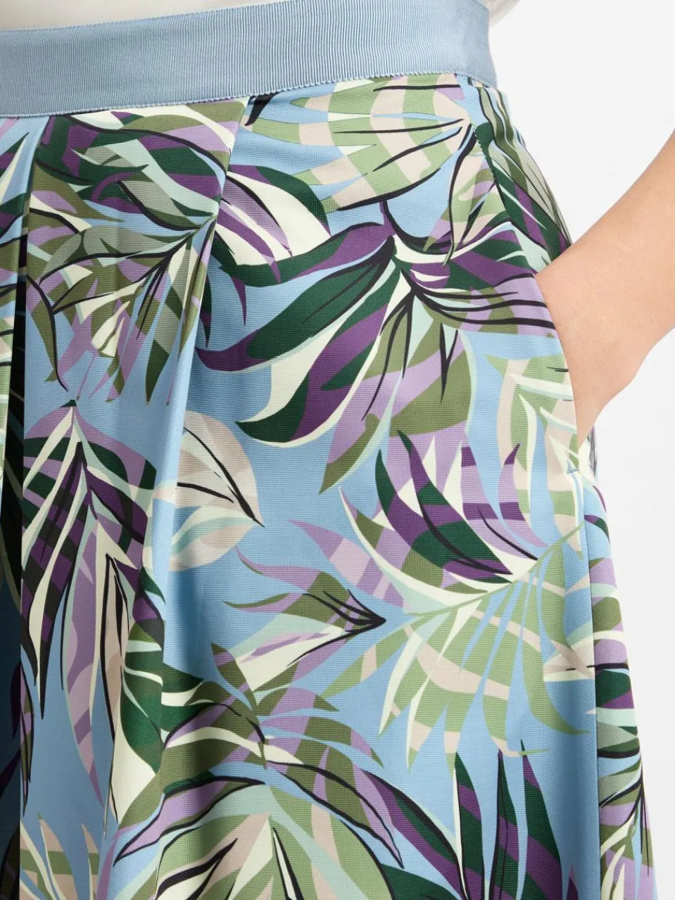 Der A-Linien-Rock RISATA von MAX&CO begeistert mit seiner schmeichelhaften Silhouette, betont die Taille und fällt sanft in die Weite, während das Jungle-Muster und die seitlichen Eingrifftaschen einen modernen Akzent setzen.