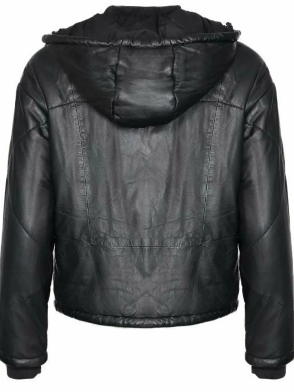 Moderne Lederjacke für Damen der Modemarke Maze. Die Jacke wurde mit zwei Seitentaschen und zwei Innentaschen mit Reißverschluss ausgestattet. Die Lederjacke besitzt eine Kapuze und kann durch einen geraden Reißverschluss geschlossen werden. Durch das schlichte Design und das feine Innenfutter ist ein angenehmer Tragekomfort garantiert.