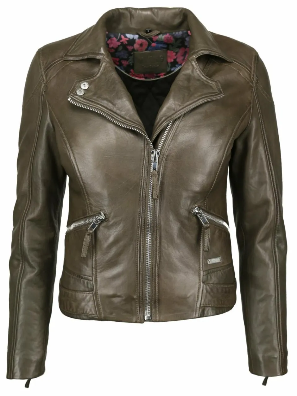 Trendige Damenlederjacke aus sanftem Lammleder der Marke MUSTANG. Die schräg eingenähten Seitentaschen mit Zipper und der schöne Hemdkragen mit Druckknöpfen machen diese Jacke zu einem besonderen Highlight. Die Passform der Jacke kann durch die Reißverschlüsse an den Ärmelenden und mit den Schnallen an den unteren Seiten angepasst werden. Die Jacke besitzt sehr schöne Ziernähte und ist mit zwei Innentaschen ausgestattet. Das gewisse Etwas erhält Sie durch das Blumeninnenfutter.