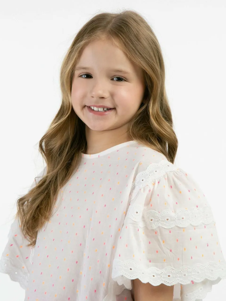 Mit der zauberhaften Mädchenbluse von myMo KIDS werden auch die Kleinen zu jungen Trendsettern. Das legere Modell ist aus einem leichten Baumwollgemisch und mit pastellfarbigen Pünktchen dekoriert. Eine florale Spitze an den weiten Flügelärmeln und am Top sorgt für einen sommerlichen Touch.