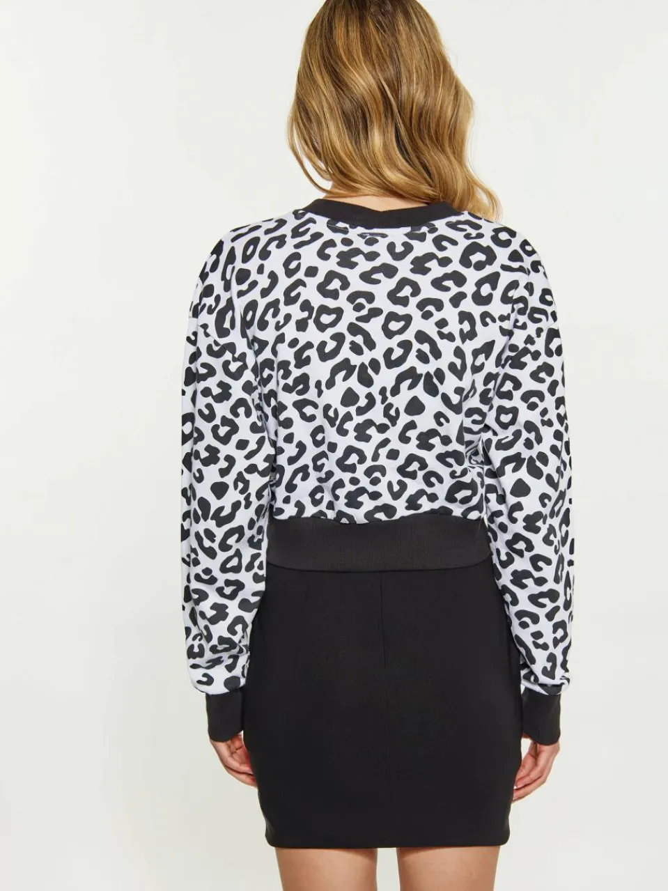 This cropped longsleeve sweatshirt boasts a fierce leopard print design. Featuring round neckline with ribbed trim, and an animal print pattern, this cropped sweatshirt offers a snug fit with its elasticized, ribbed waist and cuffs. Made from soft terry fabric, it boasts a relaxed fit for a casual yet sporty look that’s perfect for the young and trendy.
