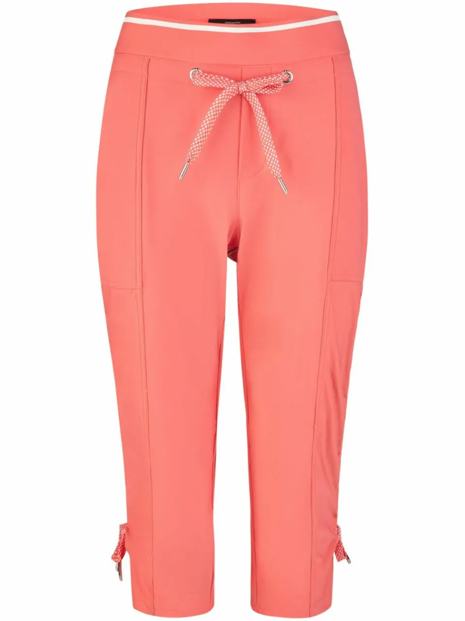 Die Damen Caprihose Celia in einem leuchtenden Korallenton ist der ideale Begleiter für sportliche Freizeitaktivitäten. Das elastische Material mit Stretch-Anteil sorgt für hohen Tragekomfort und optimale Bewegungsfreiheit. Ein Kordelzug am Bund und an den Beinen ermöglicht eine individuelle Anpassung der Passform. Mit zwei Fronttaschen mit Knopf und angedeuteten Gesäßtaschen bietet die Hose praktische Details.