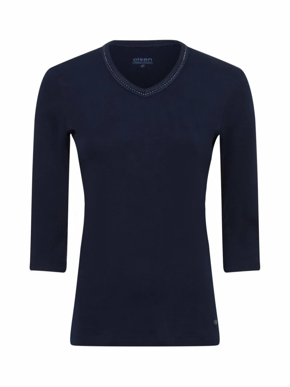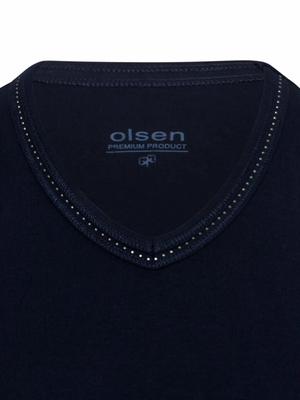 Der mit Mini-Ziersteinen und Overlocknähten verzierte V-Ausschnitt schenkt dem figurnah sitzenden Olsen Longsleeve Edda aus purer Baumwolle ein modernes Upgrade.