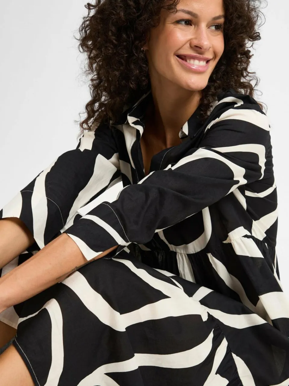 Der breite Volantsaum verleiht dem Opus Kleid Werano flow ein feminines Finish, während das grafische Allover-Design eine smarte Note hinzufügt.