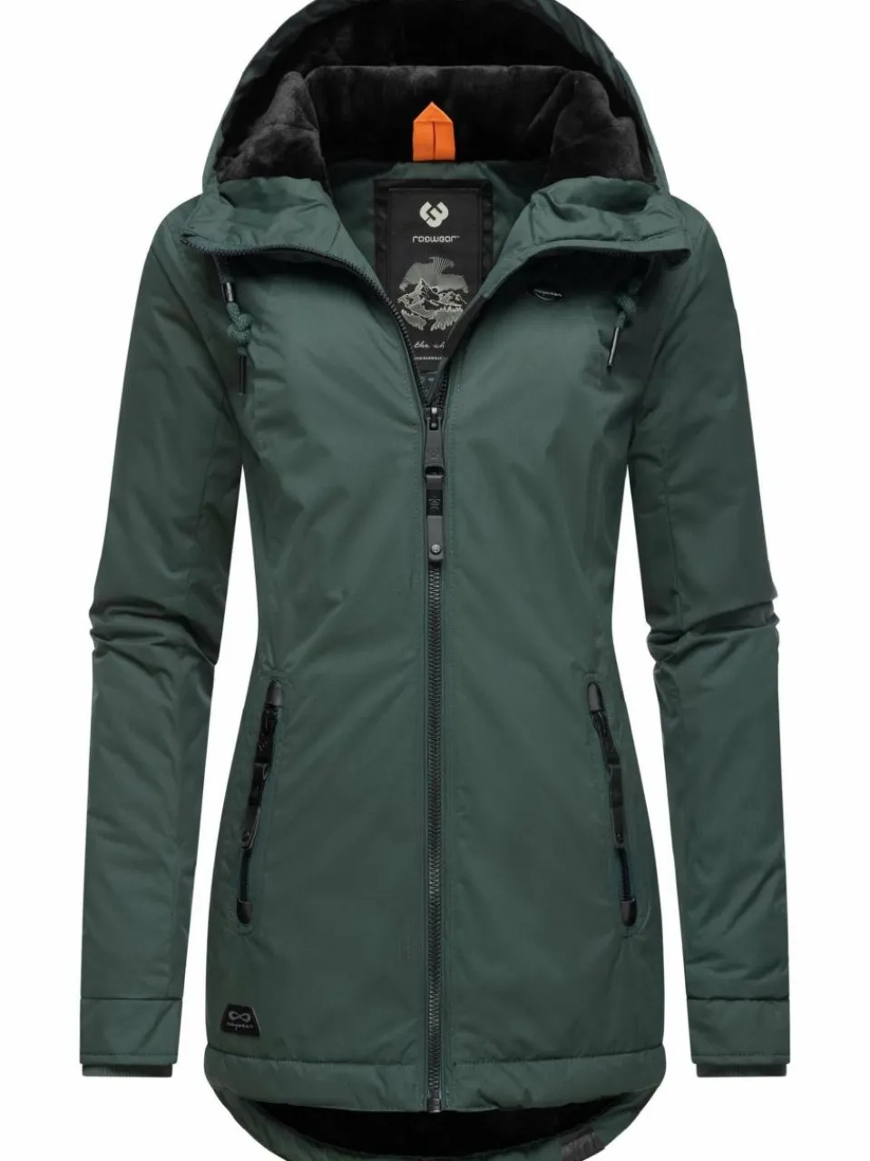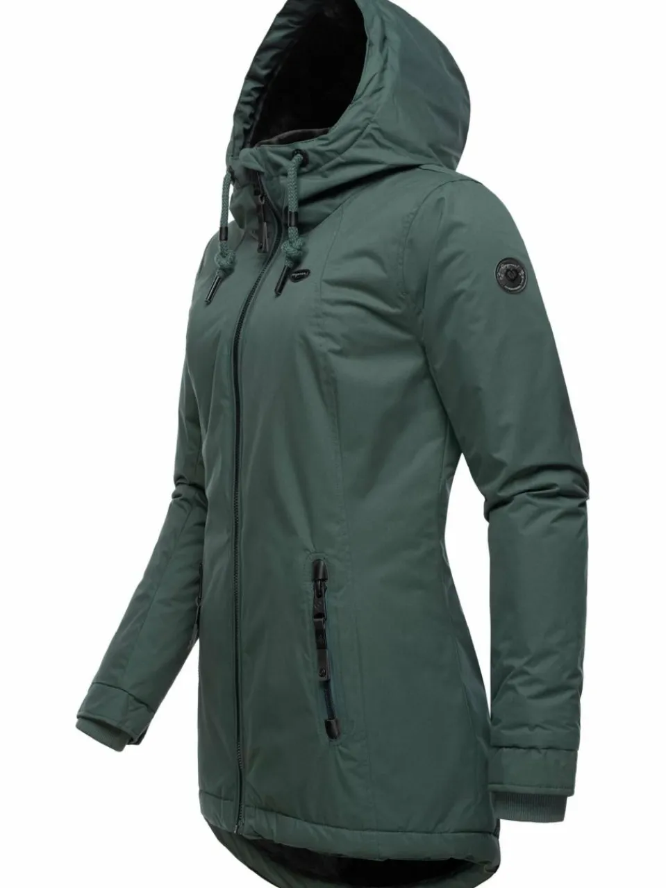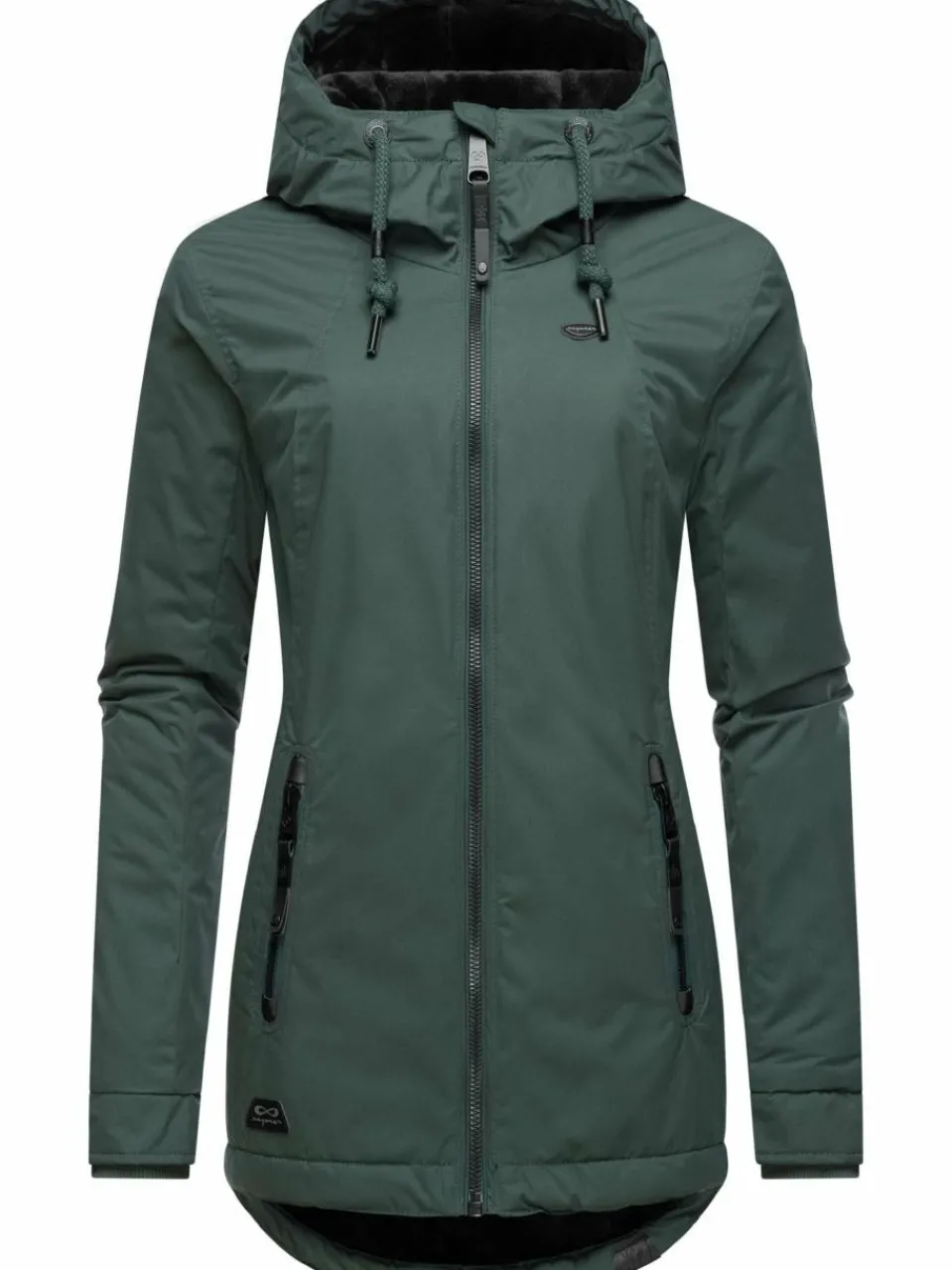 Stylischer und warmer Damen Wintermantel mit gefütterter Kapuze und dicken Tunnelzugkordeln vom angesagten Streetwear Label Ragwear.
