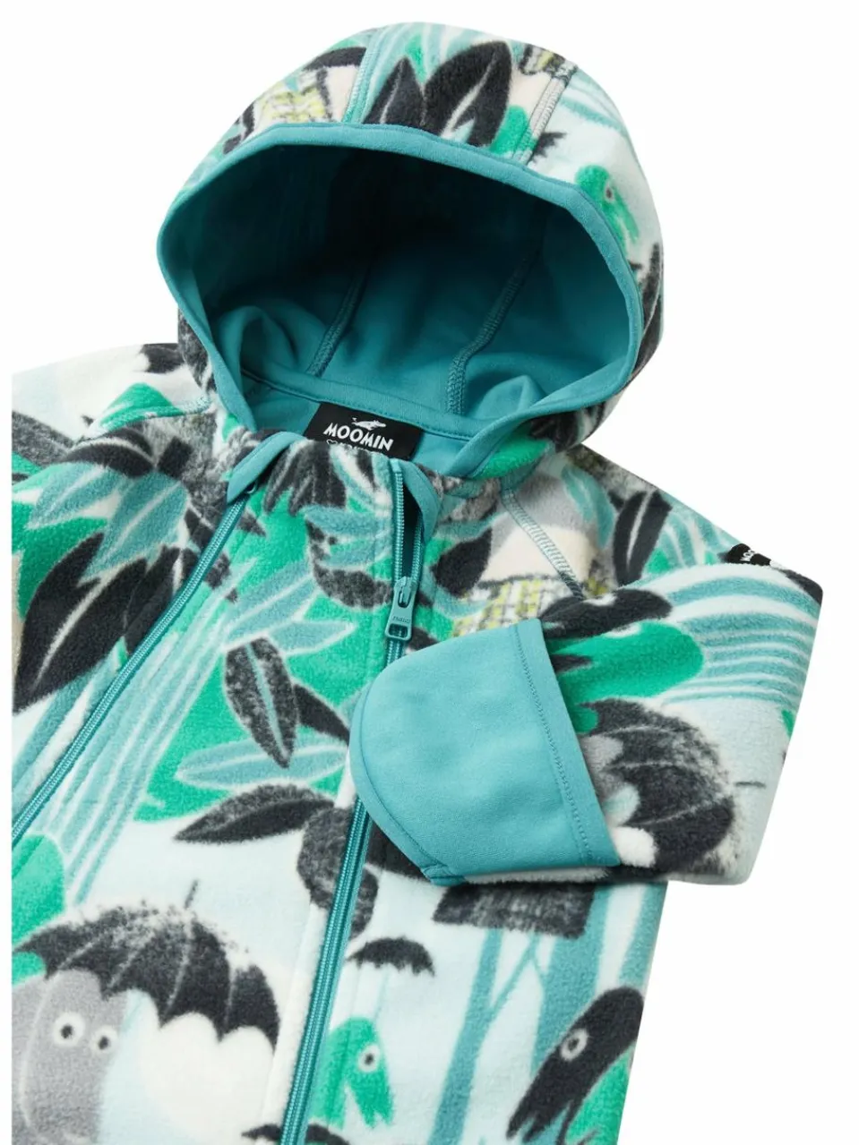 Der kuschelige Babystrampler Moomin Vindpust aus Windfleece hält Kleinkinder draußen wohlig warm. Das wasserdichte, atmungsaktive Material schützt vor Wind und leichtem Regen, und dank den beiden langen Reißverschlüssen lässt sich das Modell einfach An- und Ausziehen. Die Kapuze und Ärmelenden, die über die Hände gestülpt werden können, bieten zusätzlichen Schutz vor Wind und Wetter. Dieser Outdoor-Jumpsuit mit einem Allover-Druck lässt die liebenswerten Mumin-Figuren an Spiel und Spaß im Freien teilhaben.