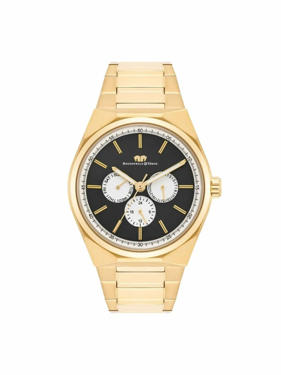 Wer gerne eine stilvolle Dress-Watch trägt, wird mit diesem Multitalent der Manufaktur Rhodenwald & Söhne glücklich. Als perfekte Symbiose zwischen Funktionalität und Design rundet sie jeden Look ab und punktet mit Finesse über die reine Zeitmessung hinaus. Das robuste, goldplattierte Edelstahlgehäuse mit einem passenden Edelstahl-Gliederarmband spielt mit dem kühnen Kontrast zwischen warmem Goldglanz und dunklen Zifferblatt.