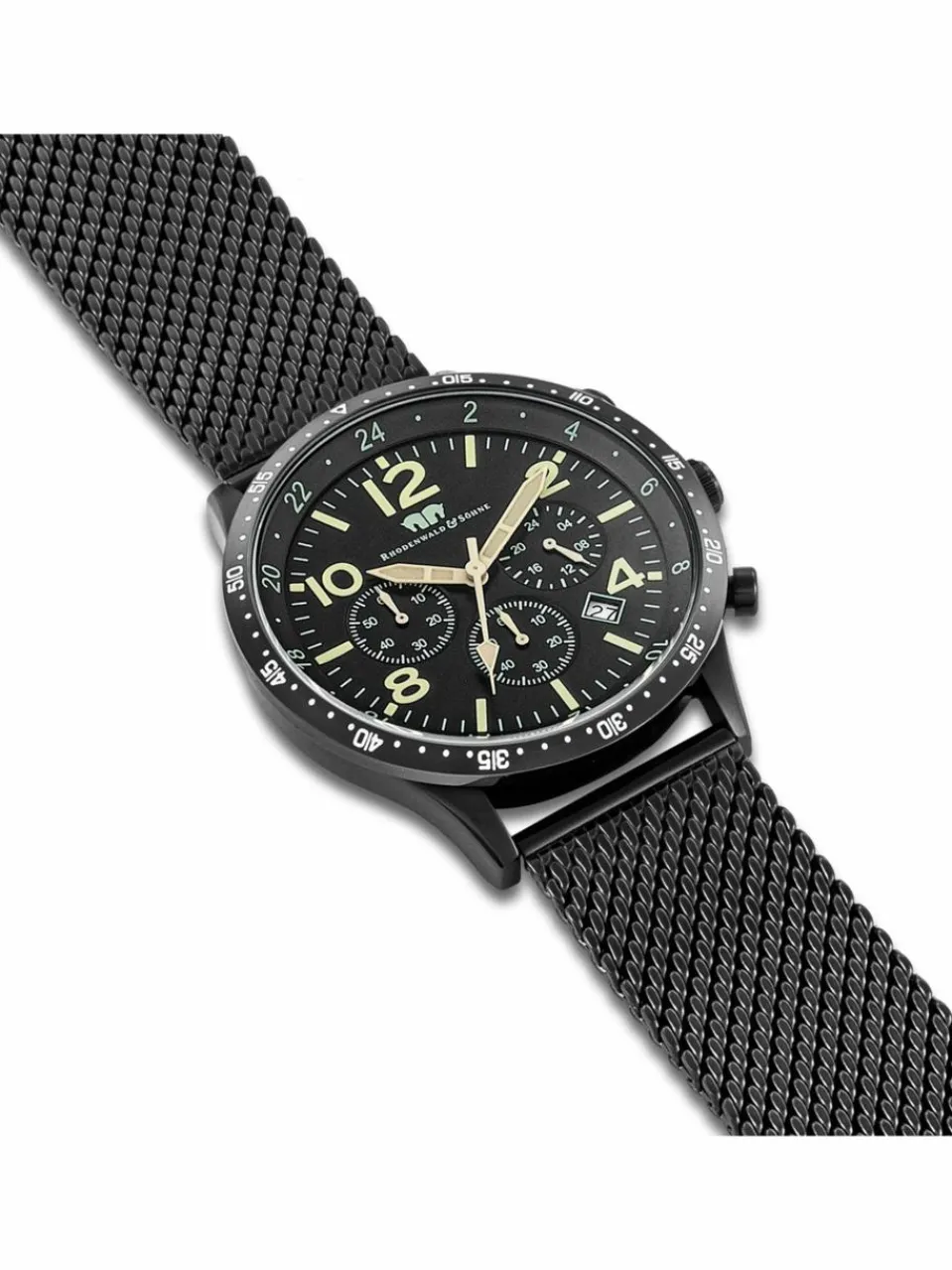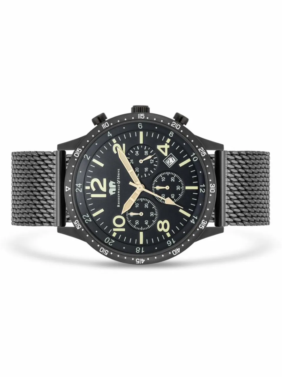 Mit Datum, Stoppuhr und 24-Stunden-Anzeige vereint der sportliche Chronograph der Uhrenmanufaktur Rhodenwald & Söhne die beliebtesten Funktionen anspruchsvoller Uhrenliebhaber. Das maskuline Edelstahlgehäuse mit kratzfester IP-Beschichtung präsentiert drei Hilfszifferblätter in klassischer Tricompax-Anordnung, kombiniert mit schlichten arabischen Ziffern, Strichindizes und luminiszierenden Schwertzeigern.