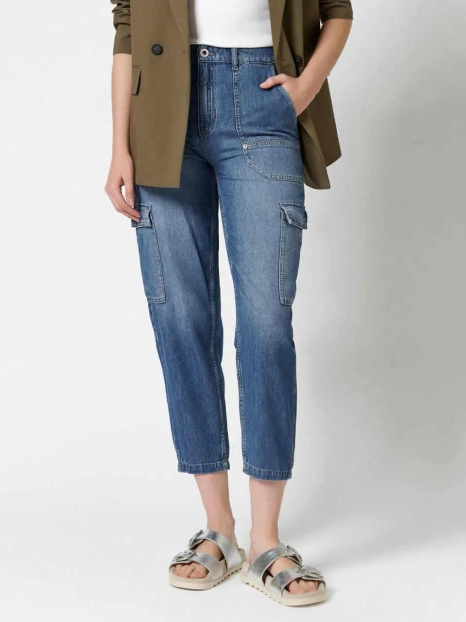 Die Jeans in 7/8-Länge zeichnet sich durch eine hohe Leibhöhe sowie einem bequemen Bund aus. Die normale Oberschenkelweite und der konische Beinverlauf garantieren eine perfekte Passform. Sie hat Eingrifftaschen vorne & Cargotaschen seitlich sowie aufgesetzte Taschen hinten. Hochwertiger Denim mit Lyocell ohne Stretch. Unser Model Vera ist 179 cm groß und trägt Größe 36/