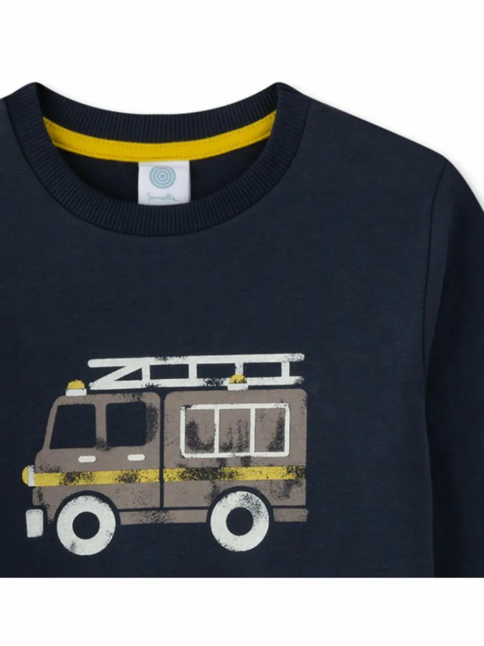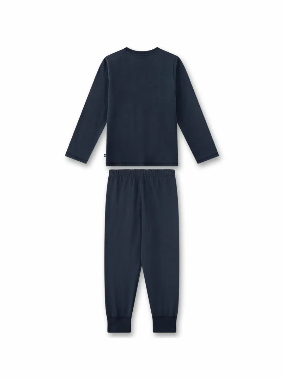 Langer Schlafanzug für Jungen von der Marke Sanetta. Langarmoberteil mit Motiv und Rundhalsausschnitt. Lange Schlafhose mit Bündchen.