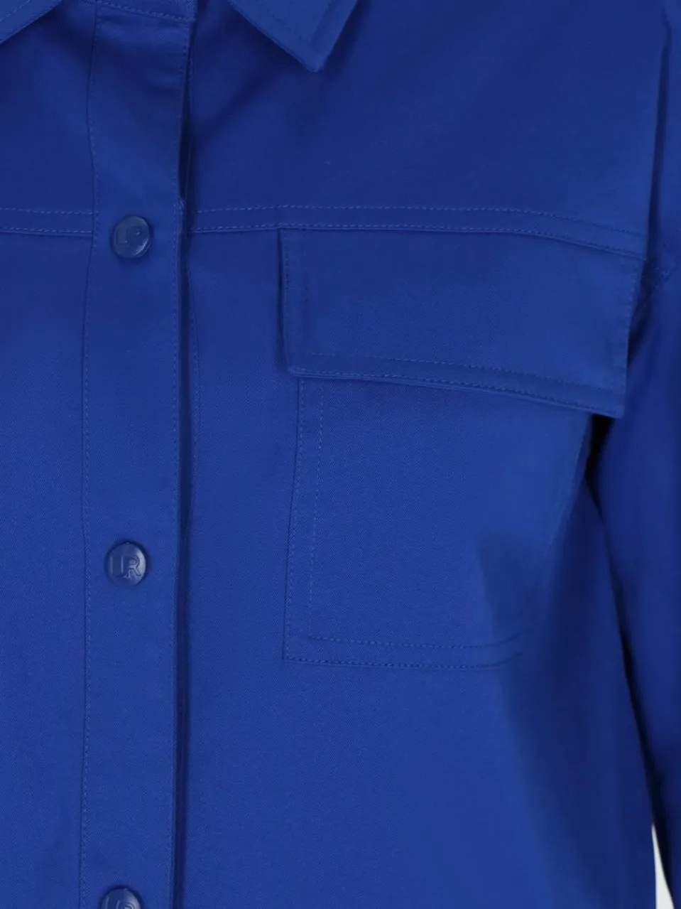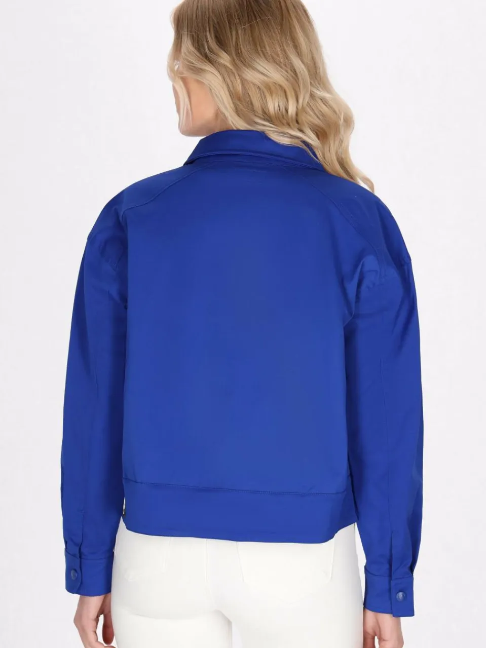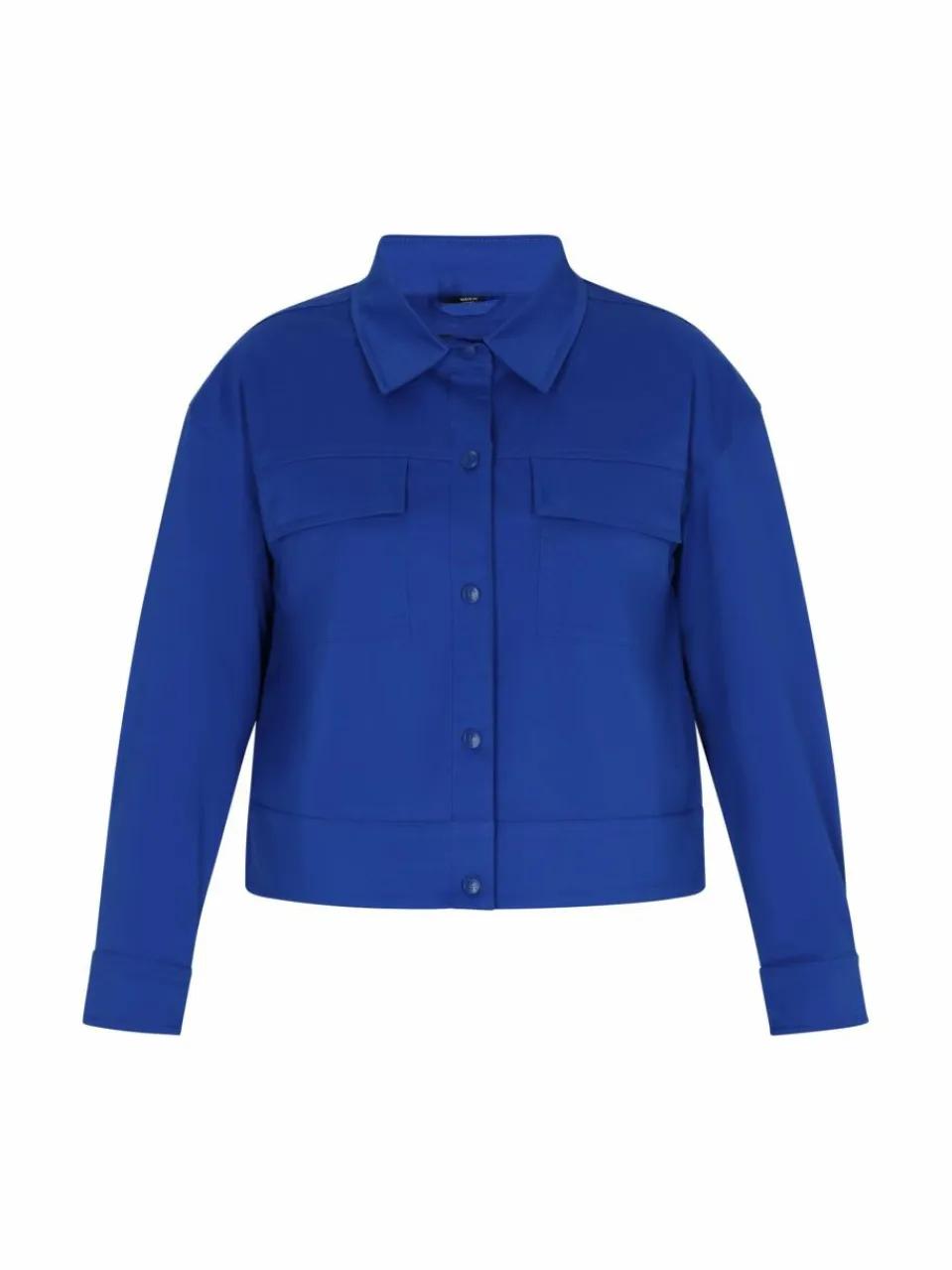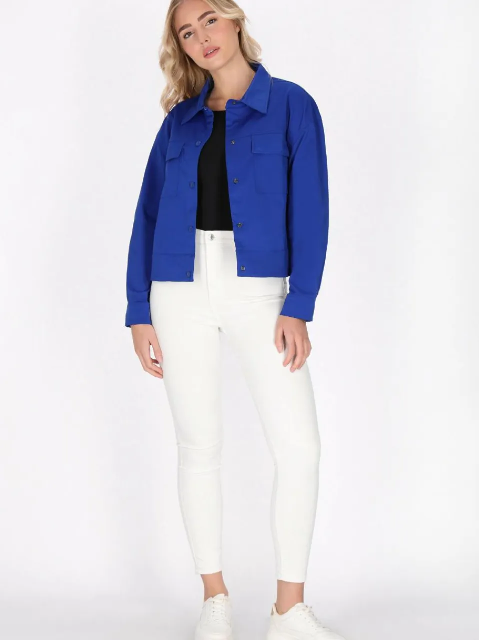Entdecken Sie eine Jacke mit einer strukturierten Silhouette, die einen klassischen Kragen und eine vordere Knopfleiste aufweist. Funktionale Brusttaschen mit Klappenverschlüssen verbessern das Design. Lange Ärmel mit geknöpften Manschetten bieten Verstellbarkeit. Der verkürzte Saum und die taillierte Passform sorgen für ein elegantes Aussehen, das durch Nähte für zusätzliche Struktur und Form betont wird.