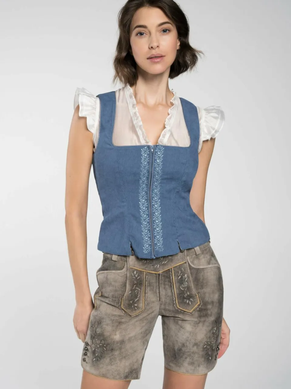 Für einen dezenten und stilvollen Look steht der Trachtenmieder ‚Feuer‘ von Spieth & Wensky. In schicker Cord-Optik besticht das ärmellose Oberteil durch stilvolle Stickereien sowie ein durchgehendem Reißverschluss an der Vorderseite. ‚Feuer‘ ist damit eine gelungene Ergänzung für ein traditionell-festliches Outfit.