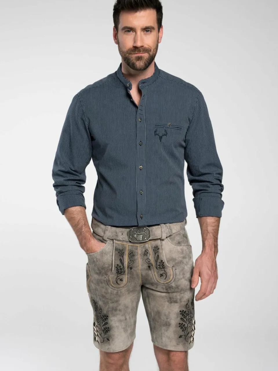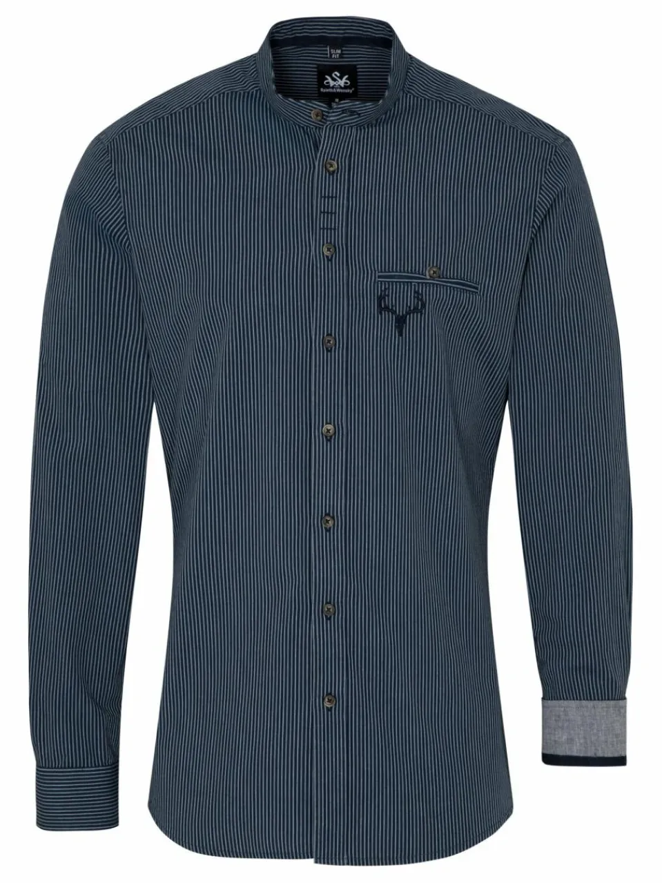 Mit dem Trachtenhemd ‚Fellen‘ von Spieth & Wensky verleihen Sie Ihrem traditionellen Outfit einen modernen Look. Dabei zeichnet sich das Hemd durch seinen Streifen-Look und seinen modernen Details aus. Dazu gehört neben dem modernen Kragen auch die farblich abgehobenen aber dezenten Knöpfe oder die Armmanschette. Dennoch besitzt das Hemd auch einige Details, wie die Hirschkopfstickerei, was es auch zur idealen Ergänzung zum Trachtenoutfit macht.