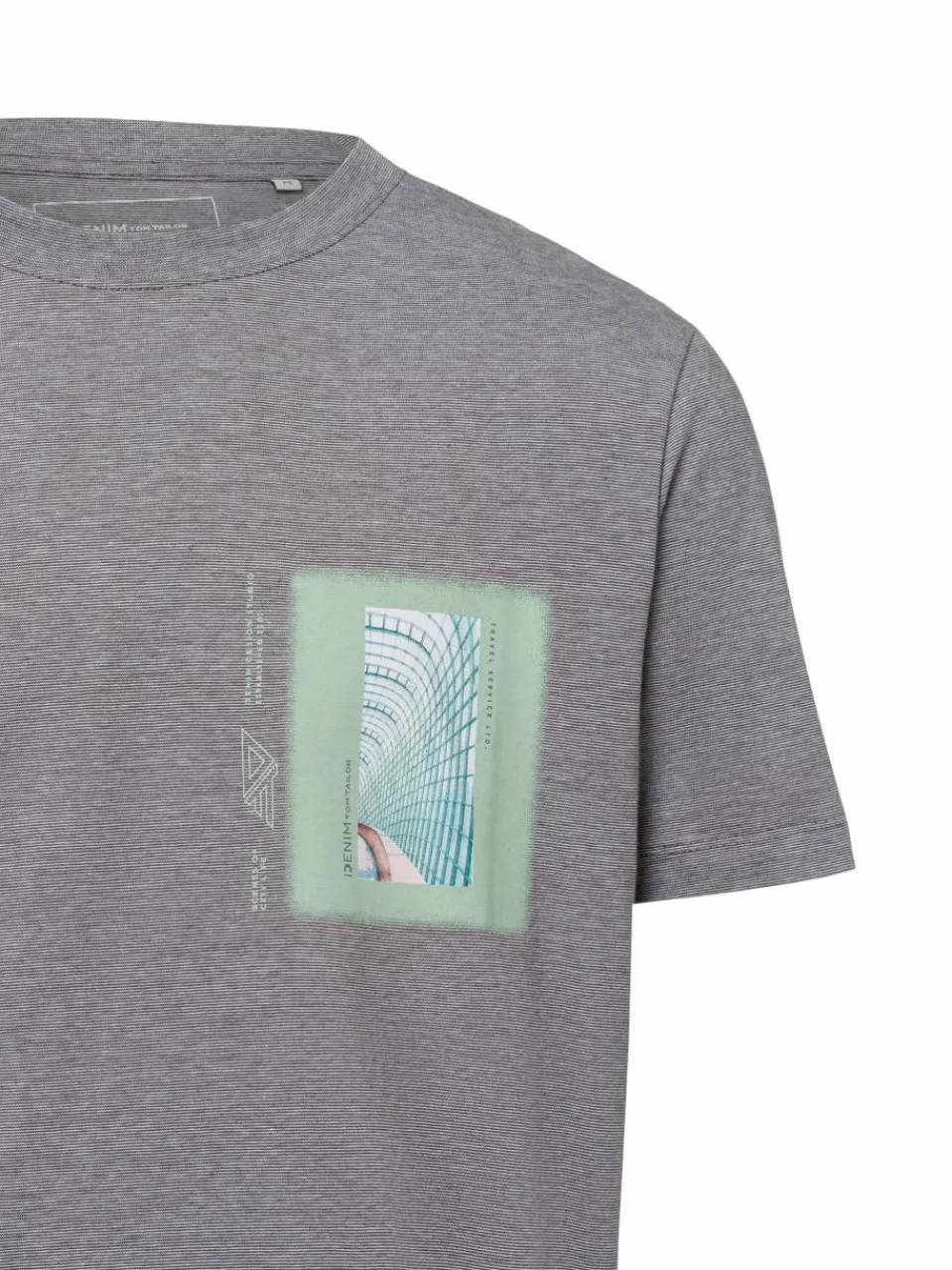 Das Tom Tailor Denim T-Shirt aus hochwertigem Baumwoll-Jersey besticht durch feine Streifen sowie einen Front-Print und bietet einen lässigen, aber zugleich stilvollen Look für den Alltag.
