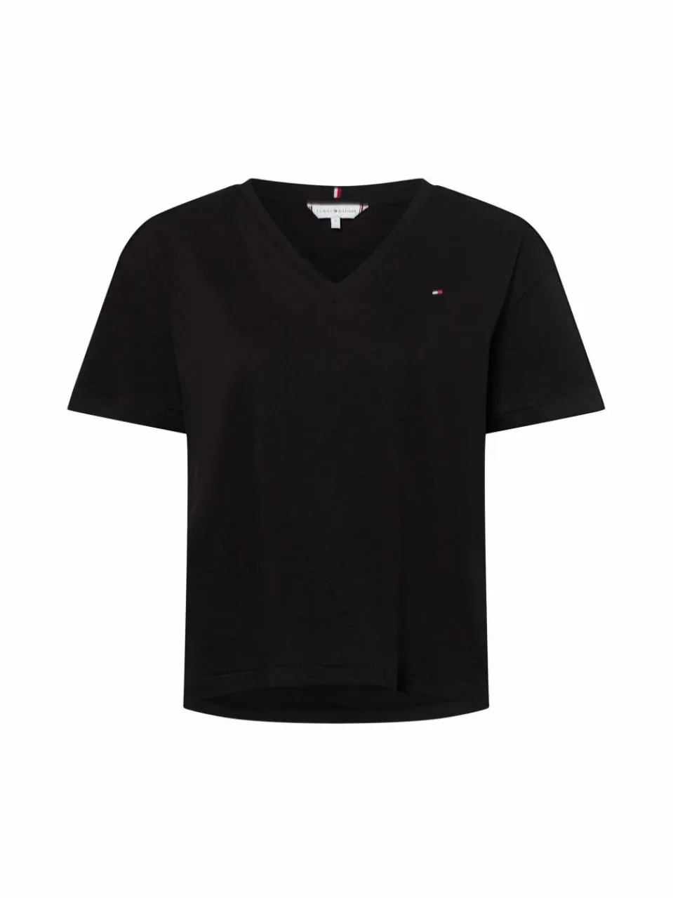 Das Tommy Hilfiger T-Shirt hat den Basic-Look perfektioniert – weiche Baumwolle, zeitloser V-Ausschnitt und zarte Label-Stickerei.