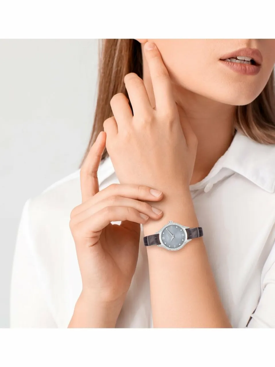 Sie wünschen sich eine Uhr mit femininerAusstrahlung, die zu jedem Outfit passt? Dann ist dieses Modell der Marke Trilani eine gute Wahl. Die Damenuhr begeistert mit einem aufgeräumten Zifferblatt mit markanten Dauphine-Zeigern und römischen Zahlen. Das geschwungene Edelstahlgehäuse, glamouröse Funkel-Akzente aus Glaskristallen und ein weiches Echtlederarmband mit Kroko-Prägung runden das hochwertige Gesamtkonzept stimmig ab und machen die Uhr zum vielseitigen Begleiter in Beruf und Freizeit.