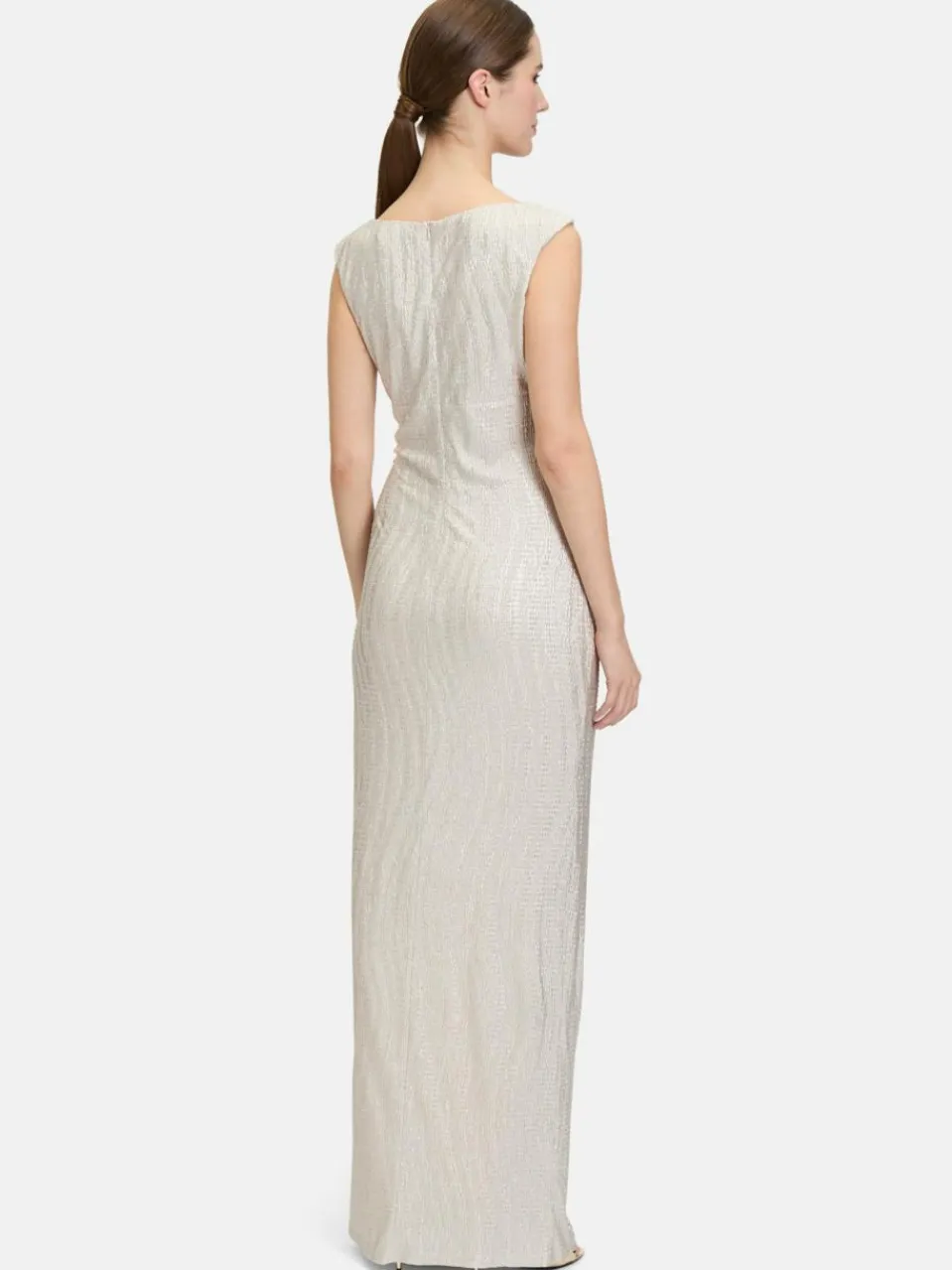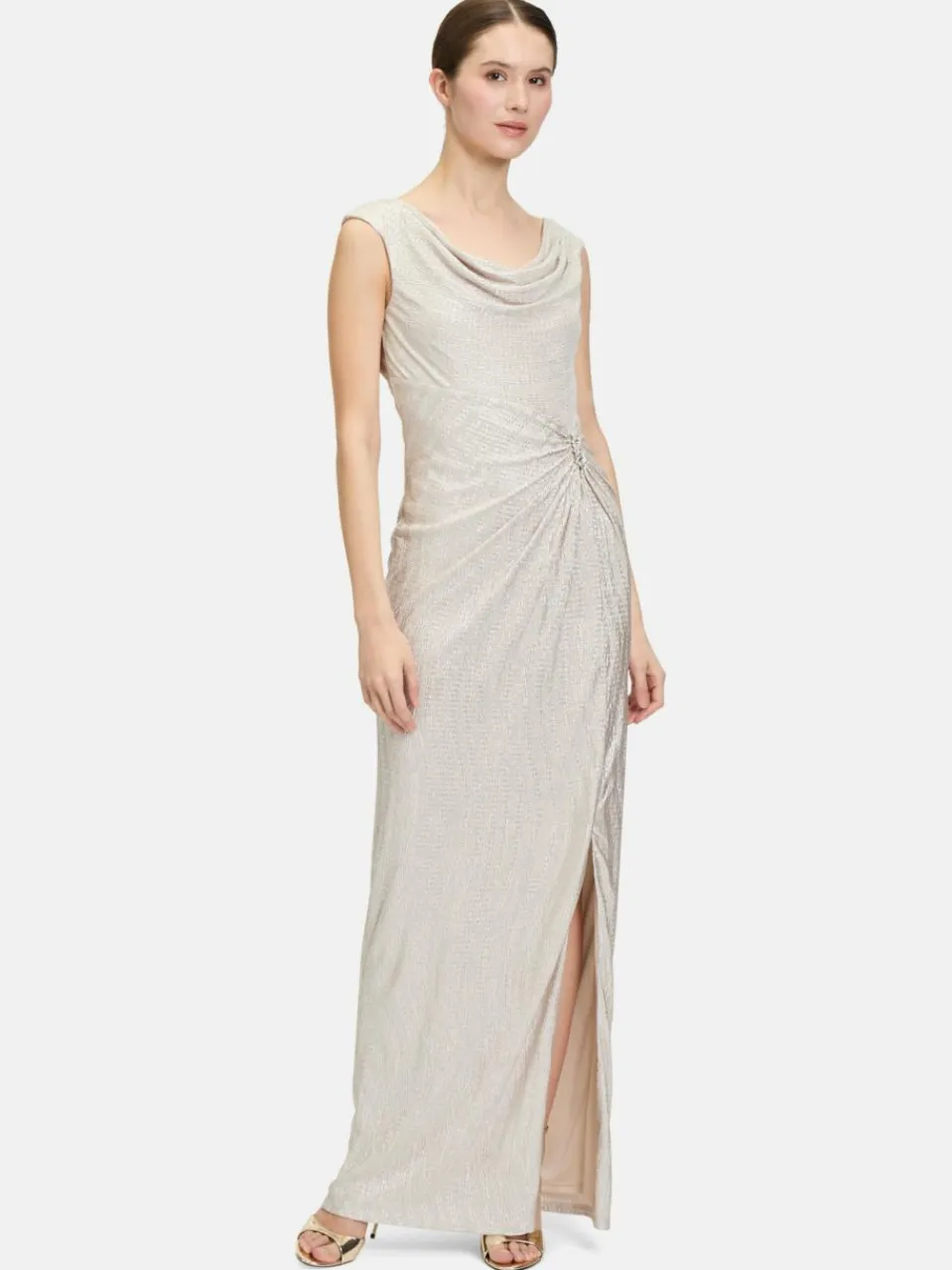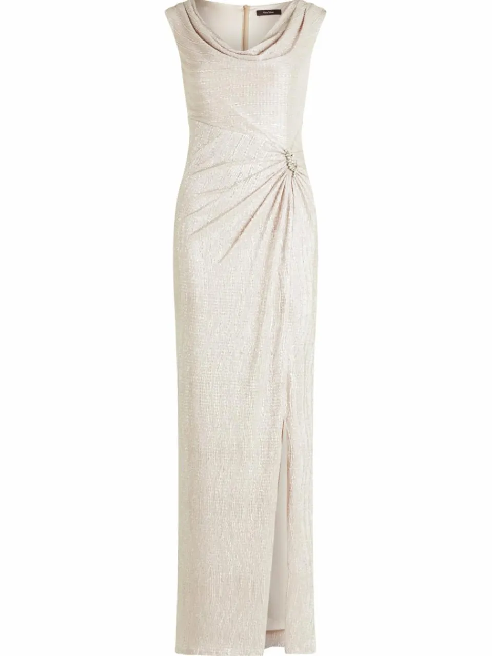 Ein absoluter Hingucker! Dieses Abendkleid vereint elegante Details und eine figurschmeichelnde Silhouette. Der edle Jersey-Stoff und die feine Raffung betonen weibliche Konturen und sorgen für eine stilvolle Ausstrahlung. Ein glamouröser Wasserfallausschitt und ein seitlicher Schlitz verleihen dem Kleid eine besondere Note, während die zierende Brosche einen Hauch von Raffinesse hinzufügt. Ärmellos und mit einem Reißverschluss im Rücken, ist es ideal für elegante Anlässe und zieht alle Blicke auf sich.