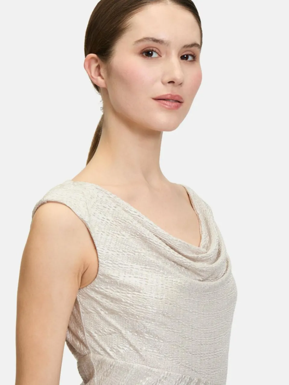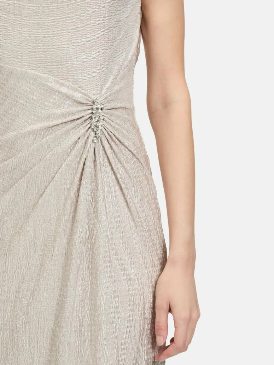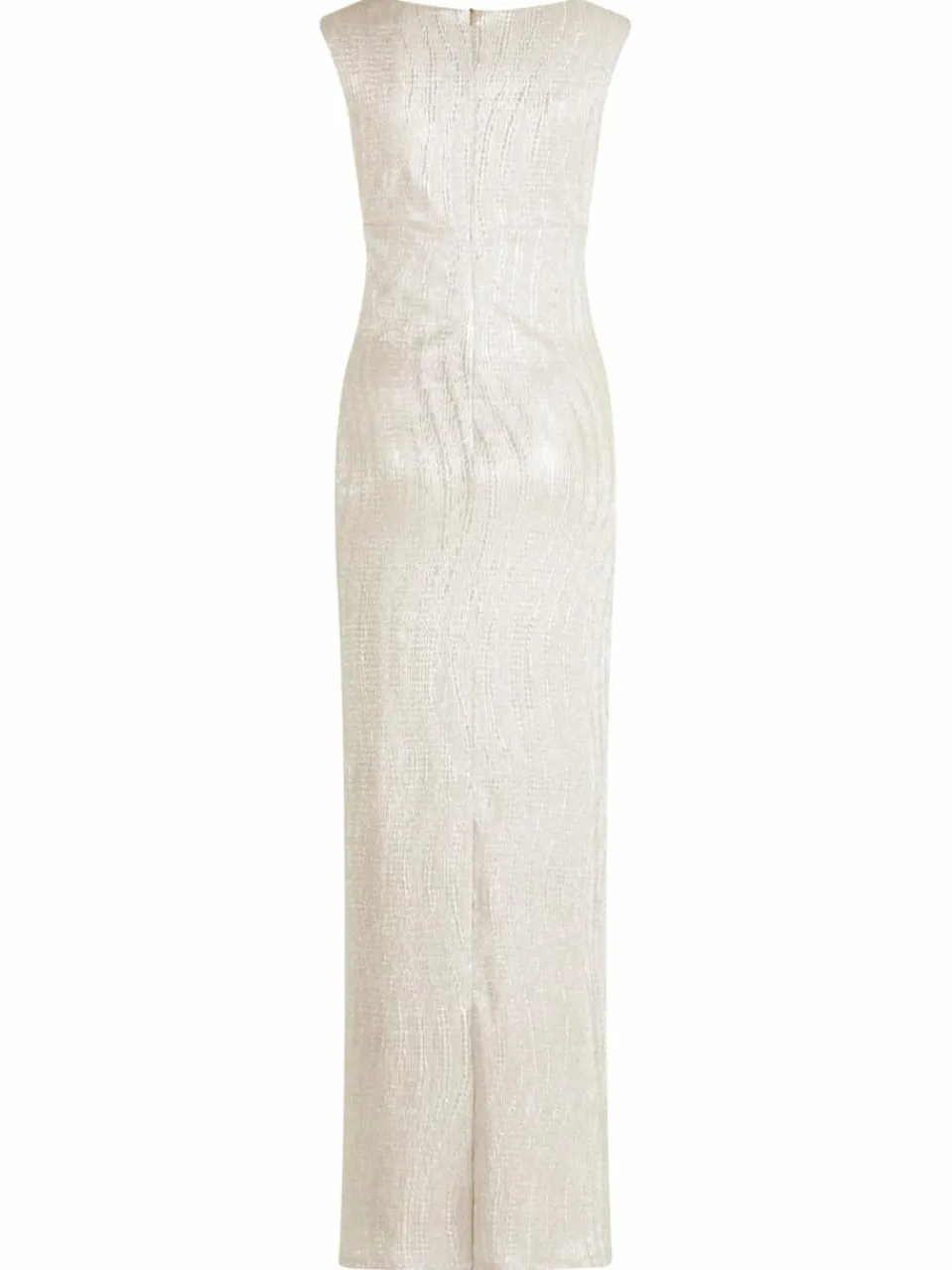 Ein absoluter Hingucker! Dieses Abendkleid vereint elegante Details und eine figurschmeichelnde Silhouette. Der edle Jersey-Stoff und die feine Raffung betonen weibliche Konturen und sorgen für eine stilvolle Ausstrahlung. Ein glamouröser Wasserfallausschitt und ein seitlicher Schlitz verleihen dem Kleid eine besondere Note, während die zierende Brosche einen Hauch von Raffinesse hinzufügt. Ärmellos und mit einem Reißverschluss im Rücken, ist es ideal für elegante Anlässe und zieht alle Blicke auf sich.