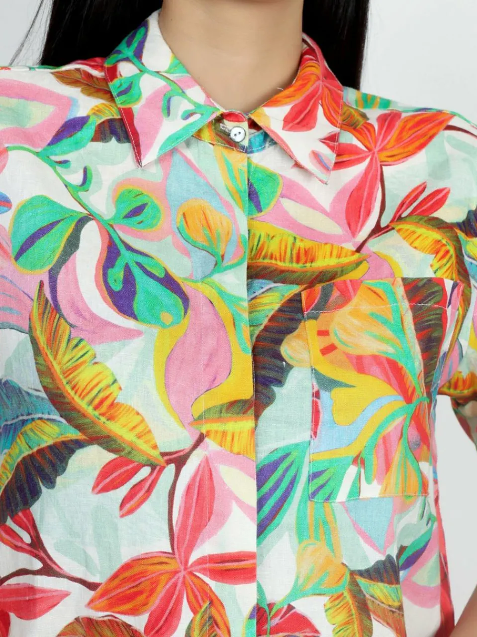 - Lässige Sommerbluse aus Leinen mit Tropendruck