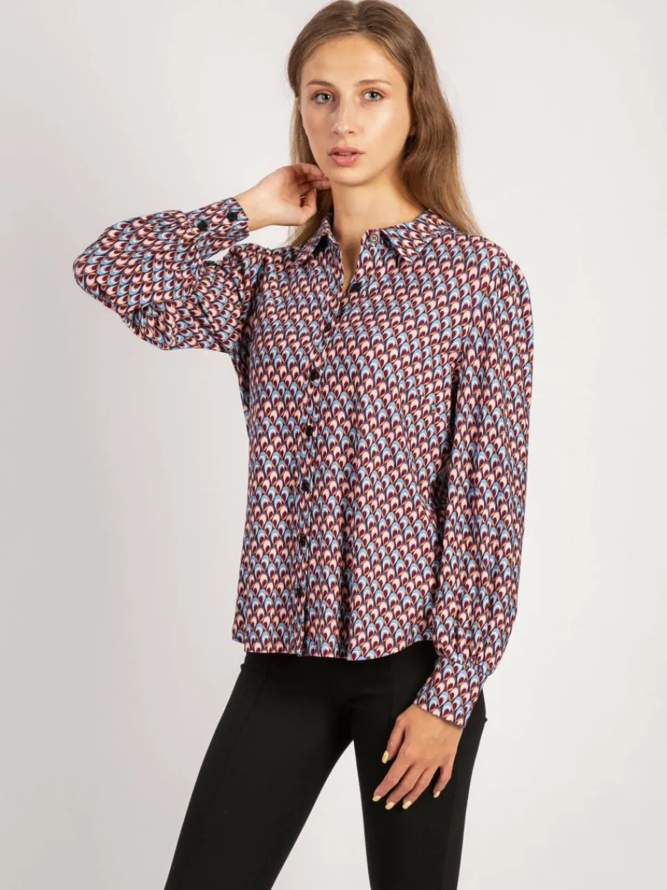 Die Jersey-Bluse verwöhnt mit der weich fließenden Viskose-Qualität auf ganzer Linie. Auch optisch ist sie ein Genuss mit dem modischen, geometrischen Muster. Mit Hemdkragen, Knopfleiste und langen Ärmeln mit Manschette und Schlitz. Formende Brustabnäher. Das Model trägt Größe 36 – Gesamtlänge: 64 cm, Rückenbreite: 35 cm, Brustweite: 94 cm.