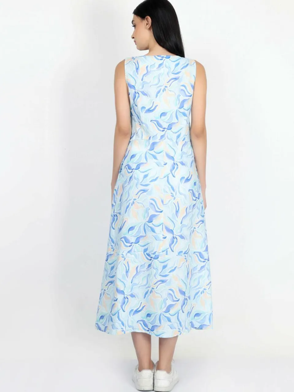 Ärmelloses Maxikleid in bequemer Passform aus weicher Leinenqualität und zartblauem druck. A-Linien-Schnitt, modische Länge, Seitentaschen und seitlicher Reißverschluss für einfaches Tragen.