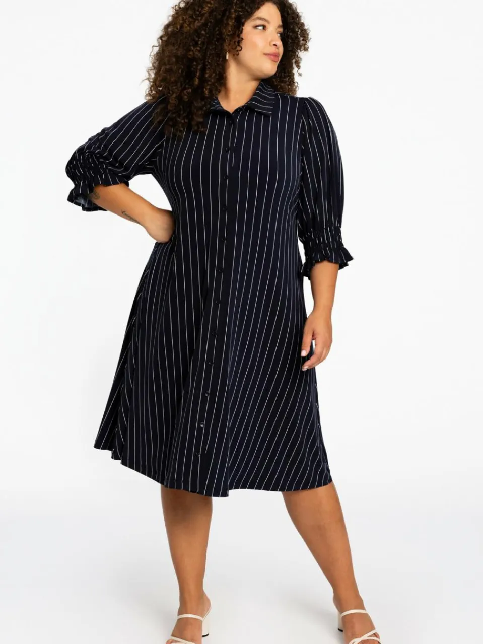 Wir lieben hübsche Nadelstreifen! Von Anzügen bis zu Kleidern, wie diesem geknöpften Kleid mit gesmokten Manschetten. Mit hübschen Absätzen oder coolen, weißen Sneakers kann man nichts falsch machen. Das Kleid ist aus Dolce-Travel-Material gefertigt und hat eine weite, entspannte Passform.