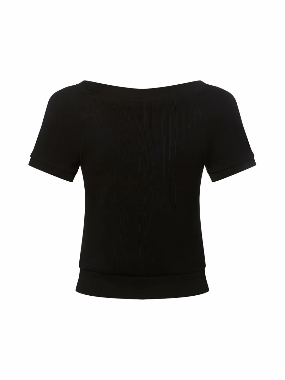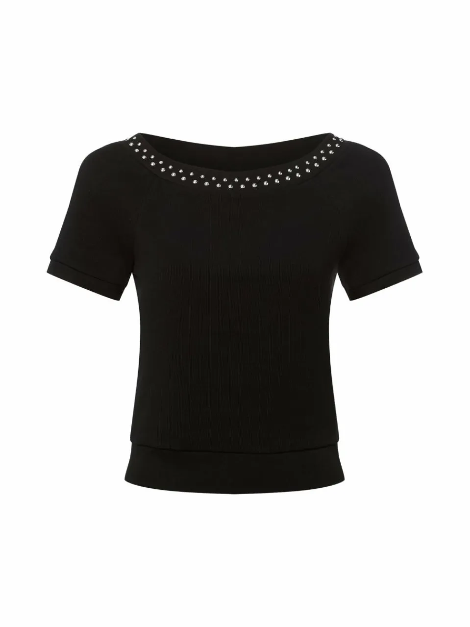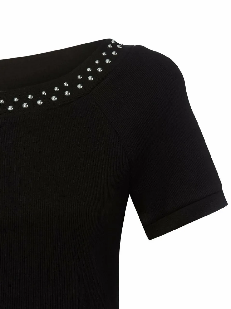 Die gerundeten Nieten am weiten Ausschnitt bringen das stretchige Rippshirt von zero zum Glänzen.