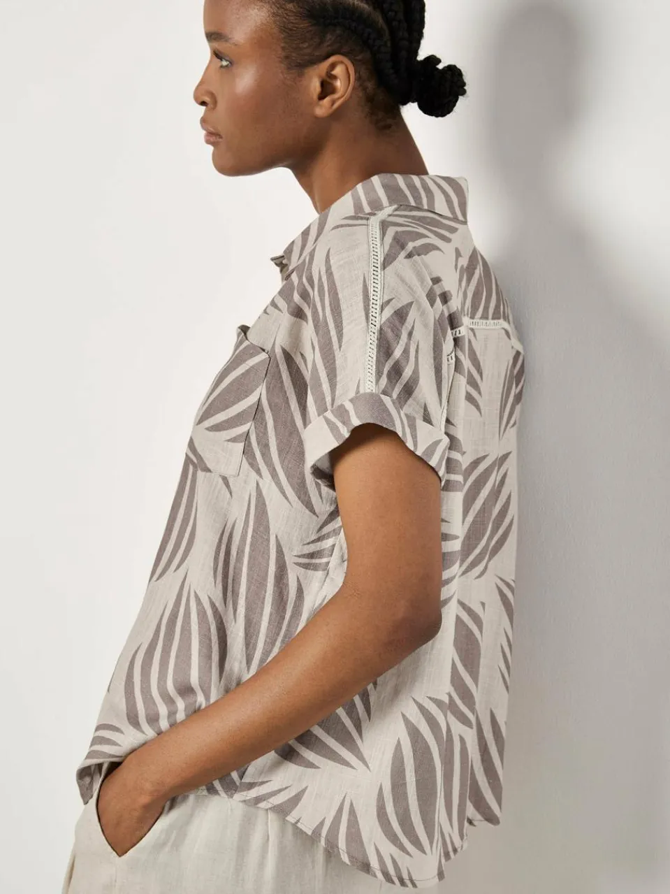 Mit seinem tropisch inspirierten Muscheldruck ist dieses gewebte Hemd ein Must-have für wärmere Tage. Es ist aus einer luftigen Leinenmischung gefertigt und verfügt über einen klassischen Kragen, eine Brusttasche und eine Button-Down-Front.
