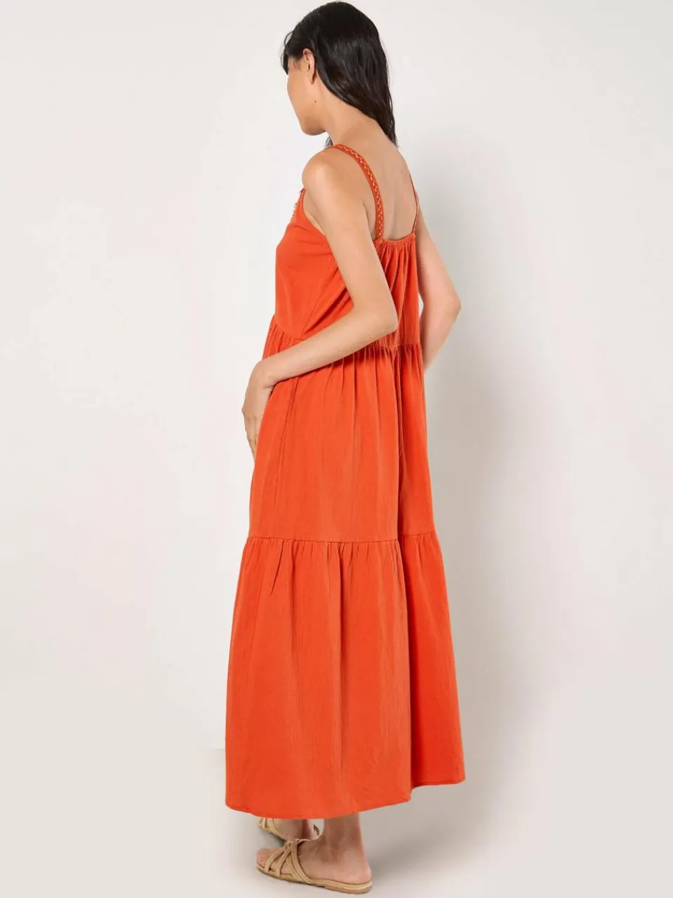 Dieses aus reiner Baumwolle gefertigte Kleid, das in fließenden Stufen zu einer schmeichelhaften Midilänge fällt, ist die perfekte Wahl für Ihren nächsten Urlaub. Es verfügt über mit Goldfolienfaden gewebte Träger, einen mit Perlenscheiben verzierten V-Ausschnitt und praktische Seitennahttaschen.