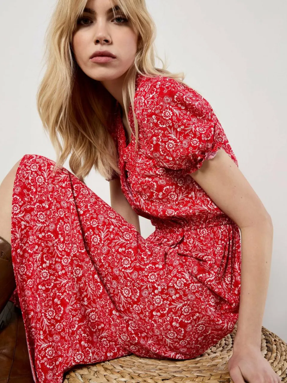 Dieses Midikleid mit Blumen und Früchten ist ein echter Hingucker in Ihrer Garderobe für warmes Wetter. Es ist leicht und gewebt und verfügt über eine schmeichelhafte Wickeloptik, hübsche Puffärmel und einen V-Ausschnitt.
