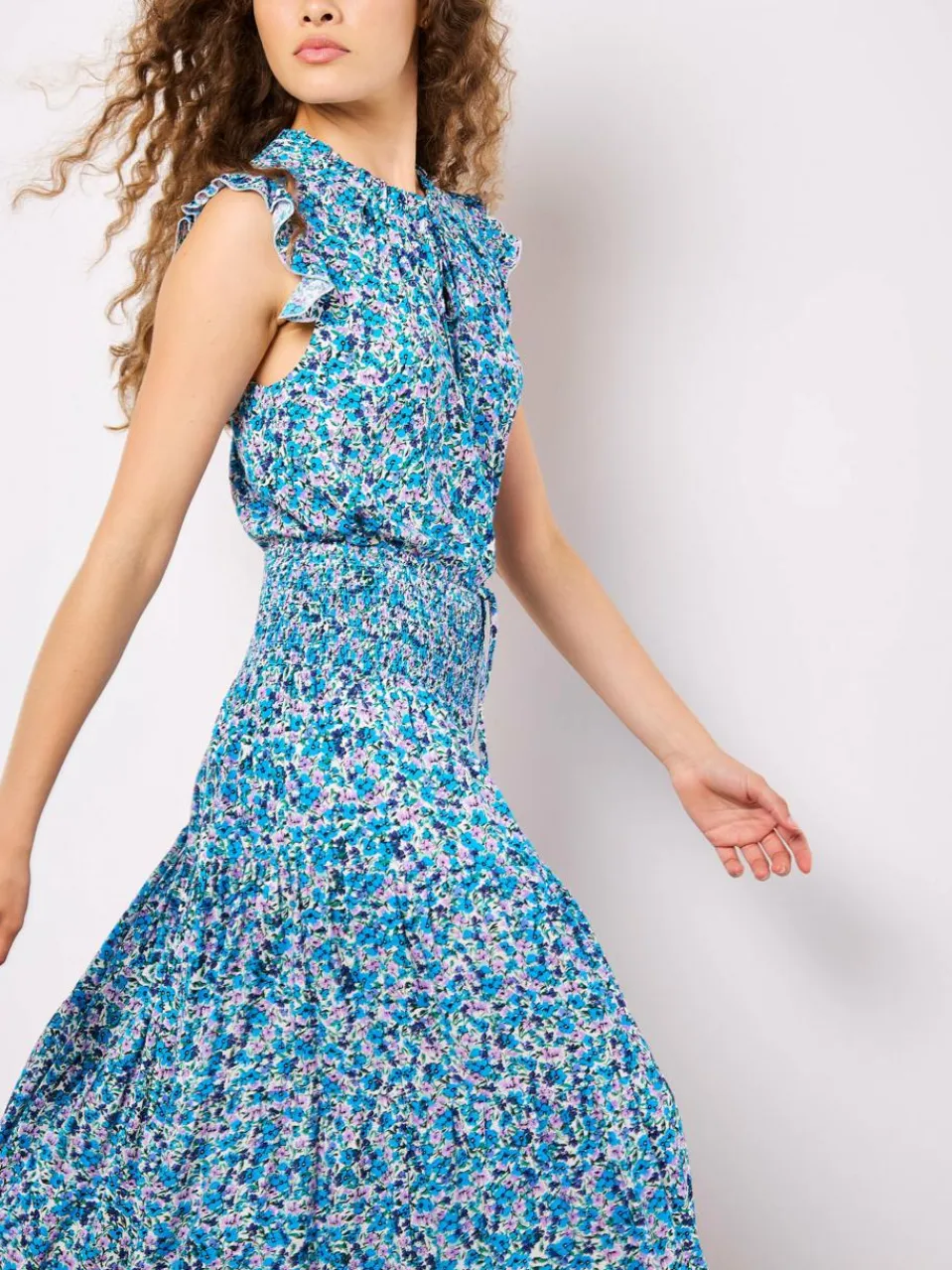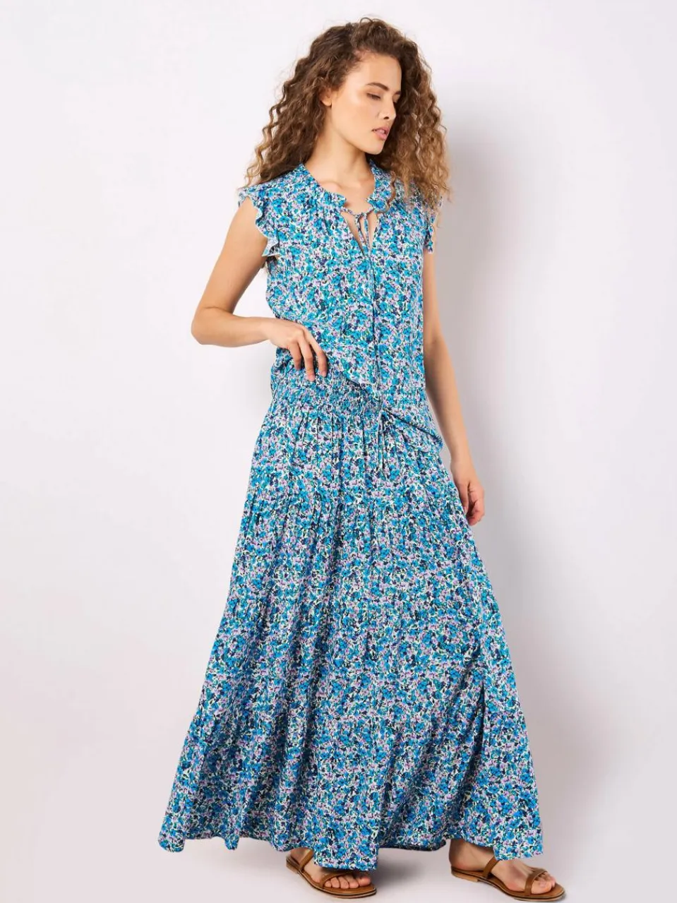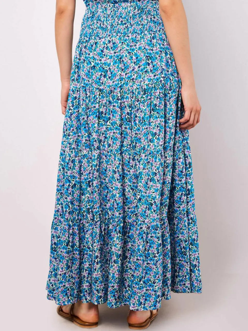 Dieser leichte, gewebte Maxirock fällt in weichen Falten und schafft eine fließende Silhouette. Er ist mit einem flippigen Blumenmuster bedruckt und hat eine gesmokte Taille mit Kordelzug für einen bequemen Sitz.