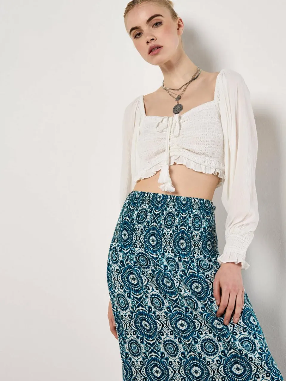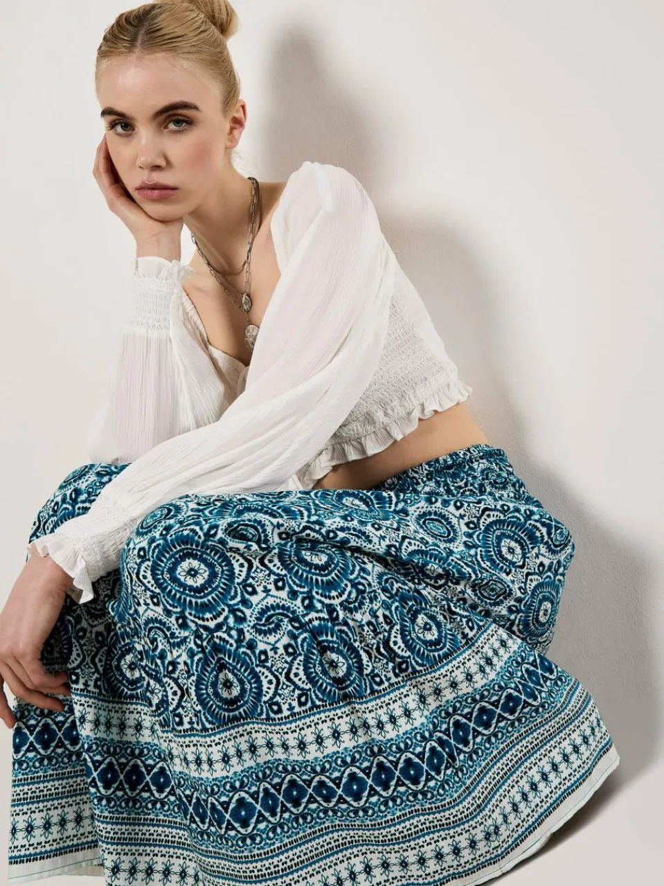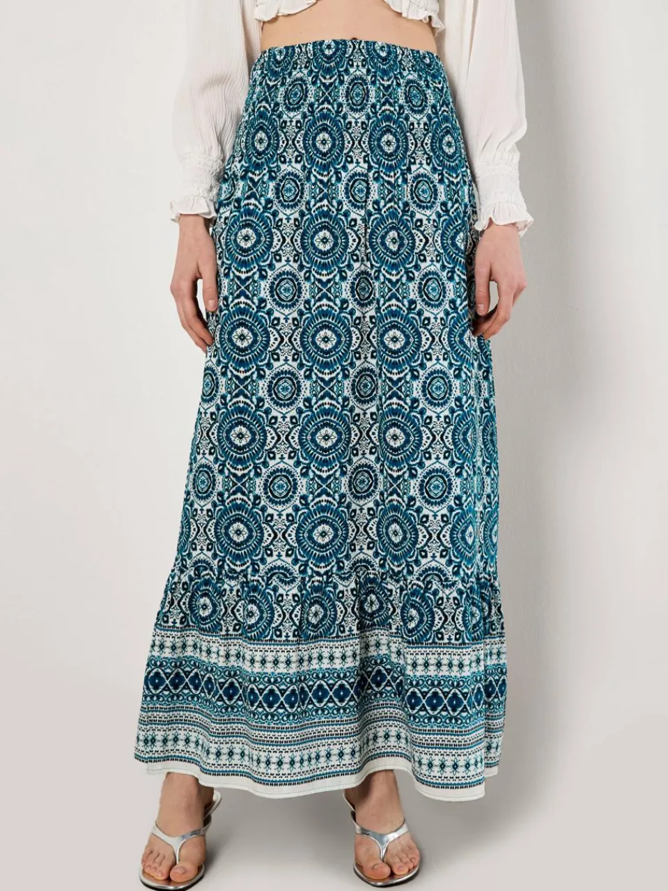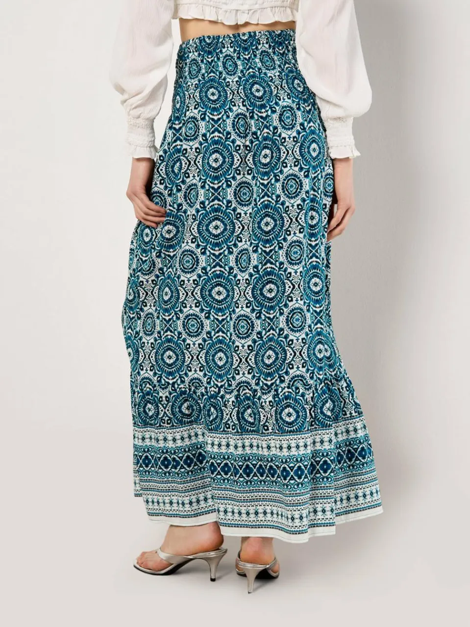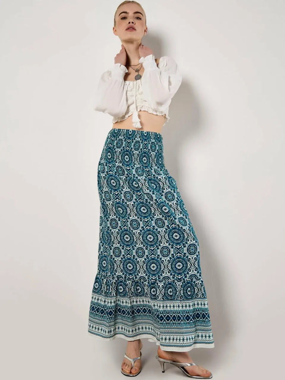 Dieser leichte, gewebte Rock aus einer Baumwollmischung besticht mit einem auffälligen Batik-Kaleidoskop-Print. Er hat eine Maxilänge, eine strukturierte Oberfläche und einen gesmokten Bund für einen bequemen Sitz.
