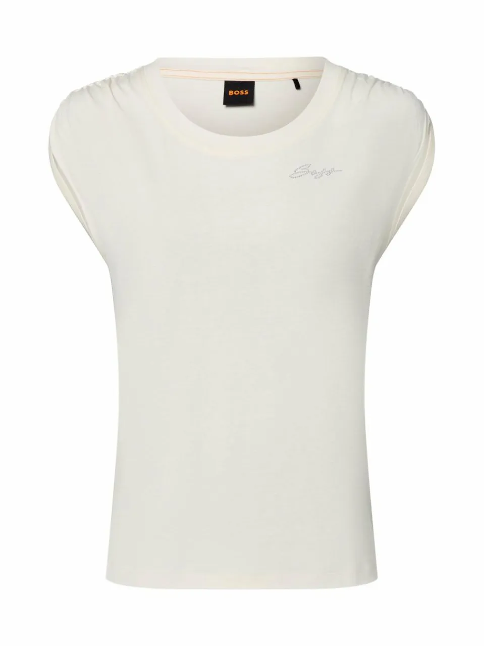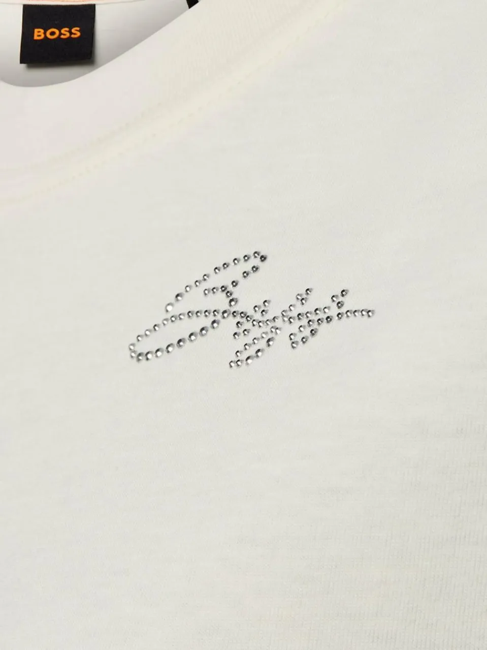 Schimmernde Blenden an den Abschlüssen, das Mini-Logo aus Ziersteinen auf Brusthöhe und offene Schnittkanten kreieren den charmant roughen Look des BOSS Orange Jerseyshirts Elai.