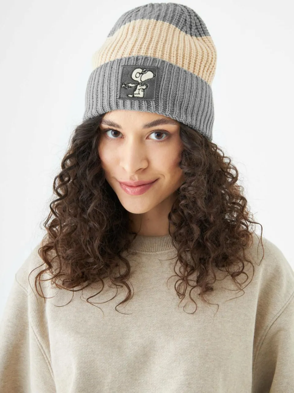 Peanuts™ Fans lieben diese Rippstrick-Mütze, weil sie so cosy ist und dank weichem Fleece-Futter garantiert nicht kratzt. Die Mütze ist aus unserer kuscheligen #19 WINTER GOLD Qualität mit einem breiten Krempelrand und kleinem Peanuts™ Snoopy Patch gefertigt. Diese winterliche Strick-Qualität aus superweichem, robustem Polyacryl und feiner Wolle ist besonders soft und wärmend.