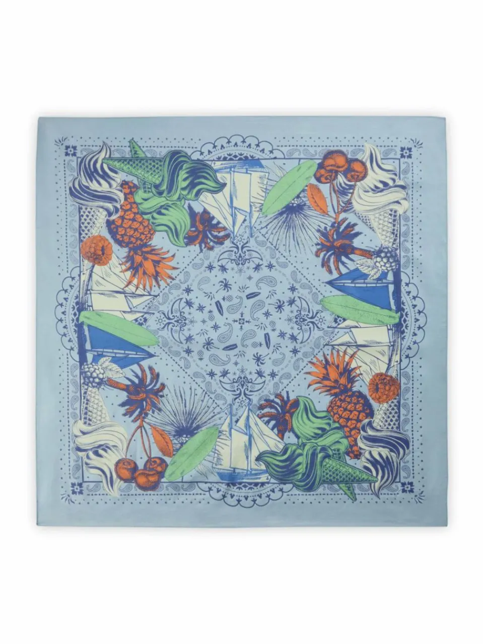 Sommerlich elegant – das perfekte Bandana für den stilvollen Look. Dieses exklusive Carré aus einem edlen Baumwoll-Seide-Mix kombiniert den klassischen Paisley-Print mit verspielten, sommerlichen Symbolen. An den Ecken findest du aufwändig eingearbeitete Motive wie Ananas, Surfbrett, Softeis, Palme und Segelboot – die perfekte Mischung aus Eleganz und fröhlichem Sommerflair.