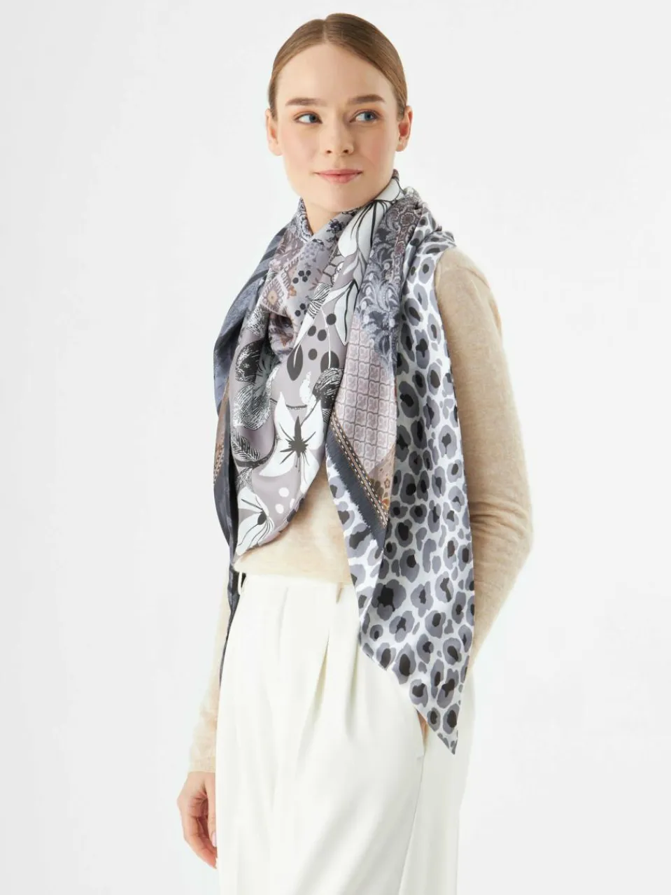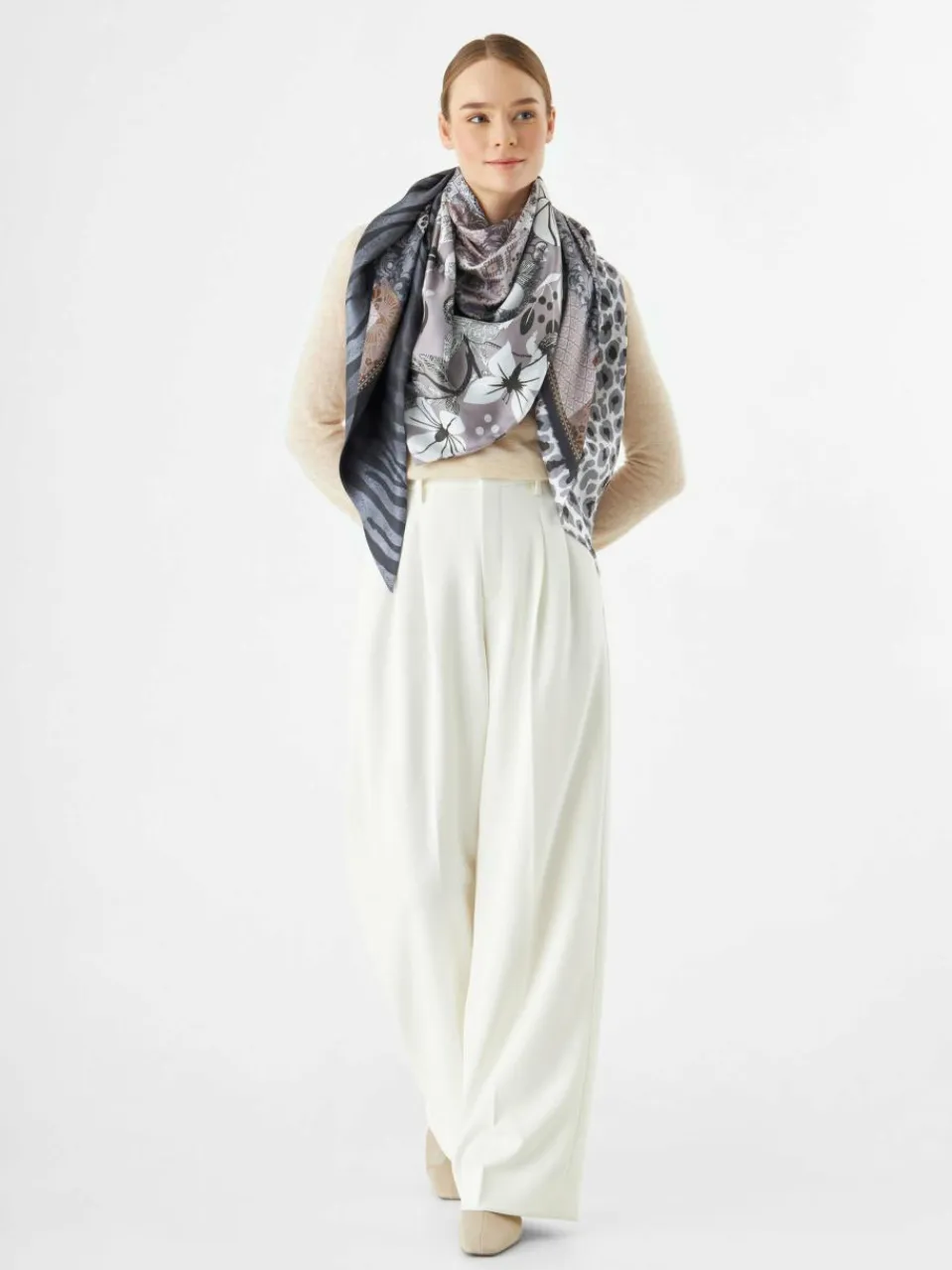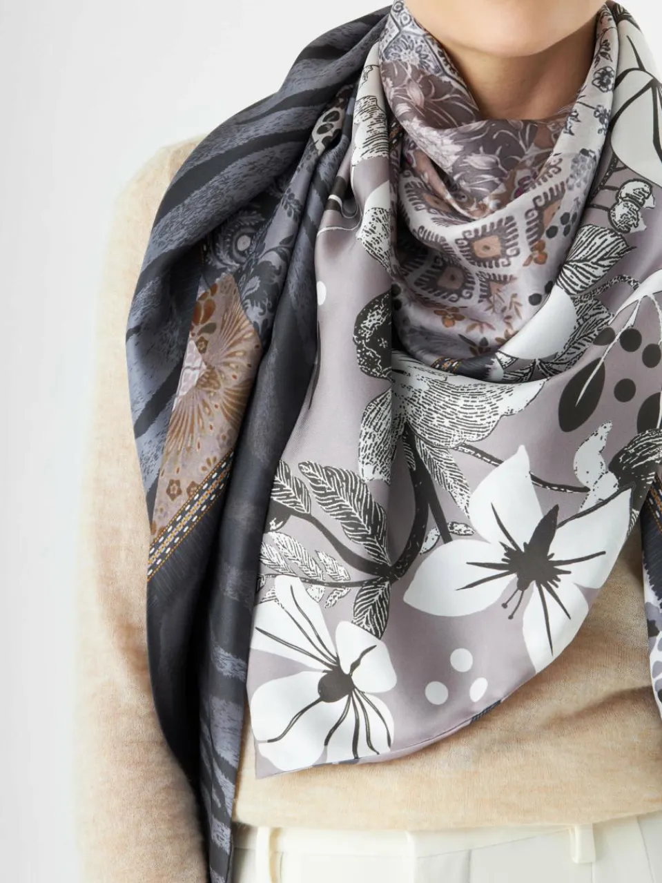 Dieses elegante Dreieckstuch aus feiner Seide macht jedes Outfit besonders. Es ist beidseitig im Pattern-Mix bedruckt und sieht im Sommer auch zum Top geknotet super aus. Hergestellt in einer chinesischen Seidenmanufaktur, überzeugt es durch seinen kühlen, geschmeidigen Griff, luxuriösen Tragekomfort und brillante Farben.