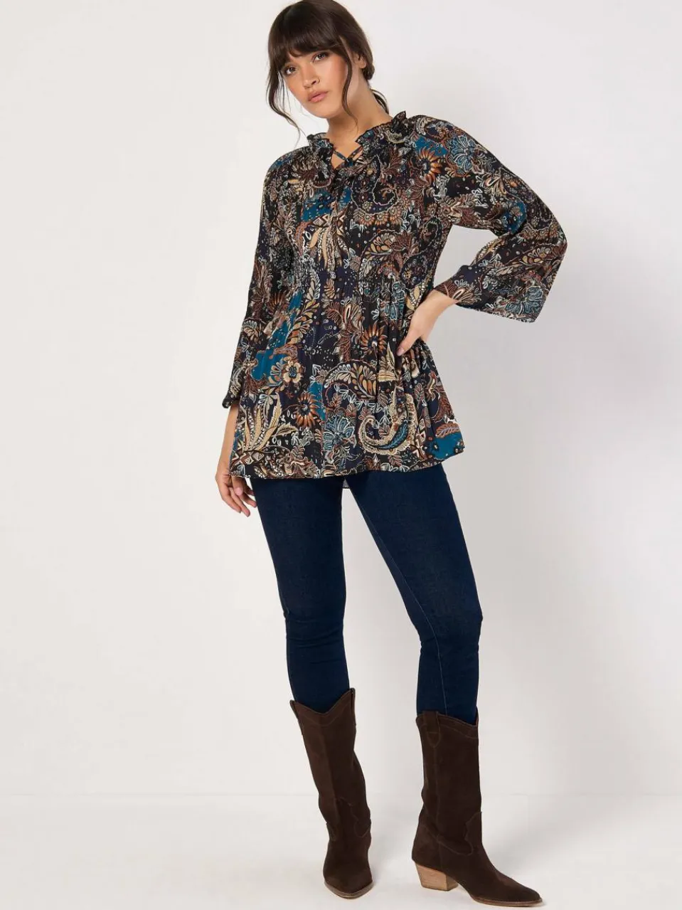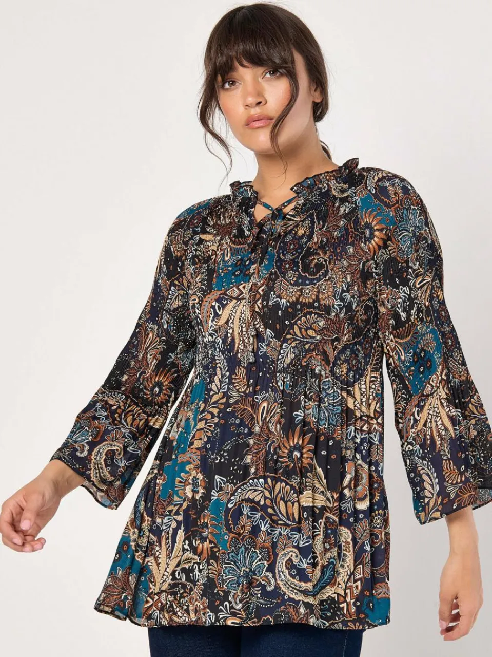 Mit dem Plissee-Blusentop erschaffen wir unkomplizierte Looks für viele Gelegenheiten. Das tolle Paisleymuster sorgt daneben für einen frischen Anblick. Die legere Schnittführung, die weiche Ware und die Trompetenärmel runden das Modell gekonnt ab.
