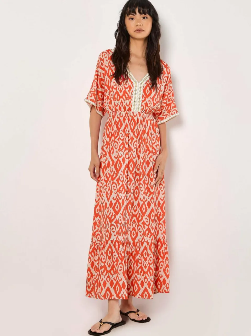 Mit seinem Ikat-Wirbel-Print und den schimmernden Metallic-Besätzen ist dieses Maxikleid ein Must-have für Ihre Garderobe bei warmem Wetter. Er ist leicht und gewebt und verfügt über einen V-Ausschnitt, Fledermausärmel und einen Rock, der in weichen Stufen fällt.