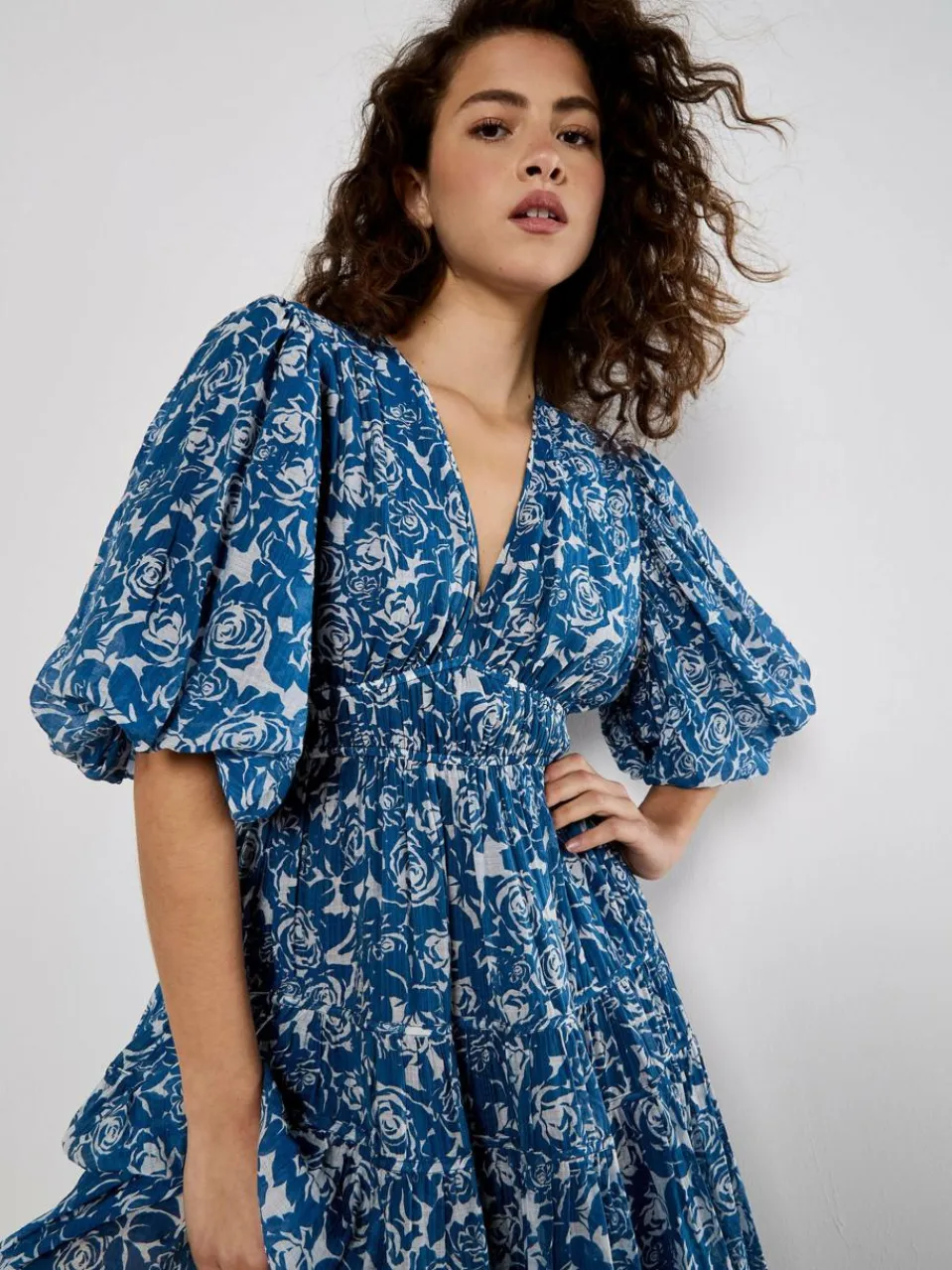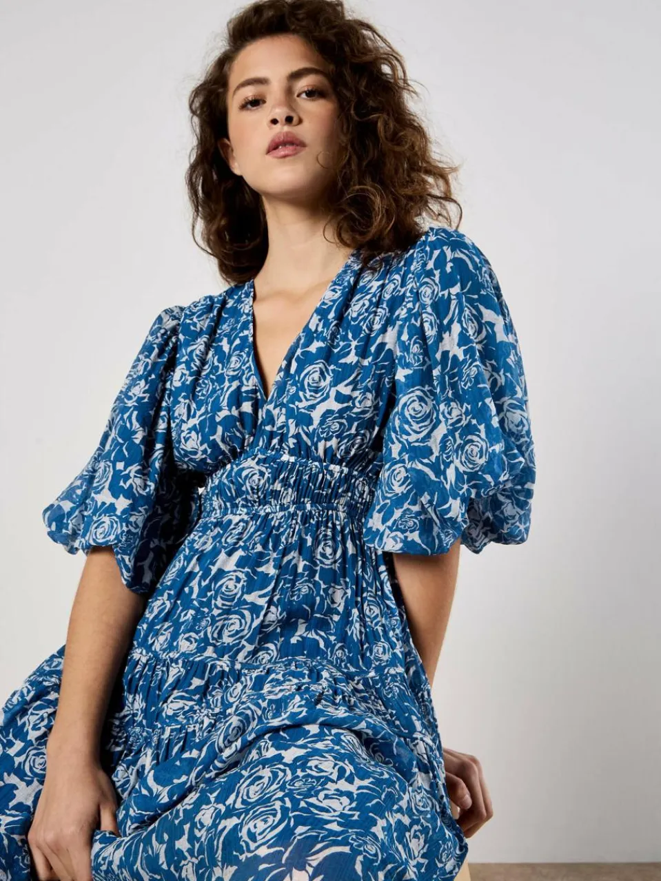 Dieses Midikleid mit hübschem Rosenprint fällt in weichen Falten und sorgt für eine feminine Silhouette. Es ist leicht und gewebt, für Komfort gefüttert und verfügt über Puffärmel, einen V-Ausschnitt und eine elastische Taille für eine schmeichelhafte Passform.