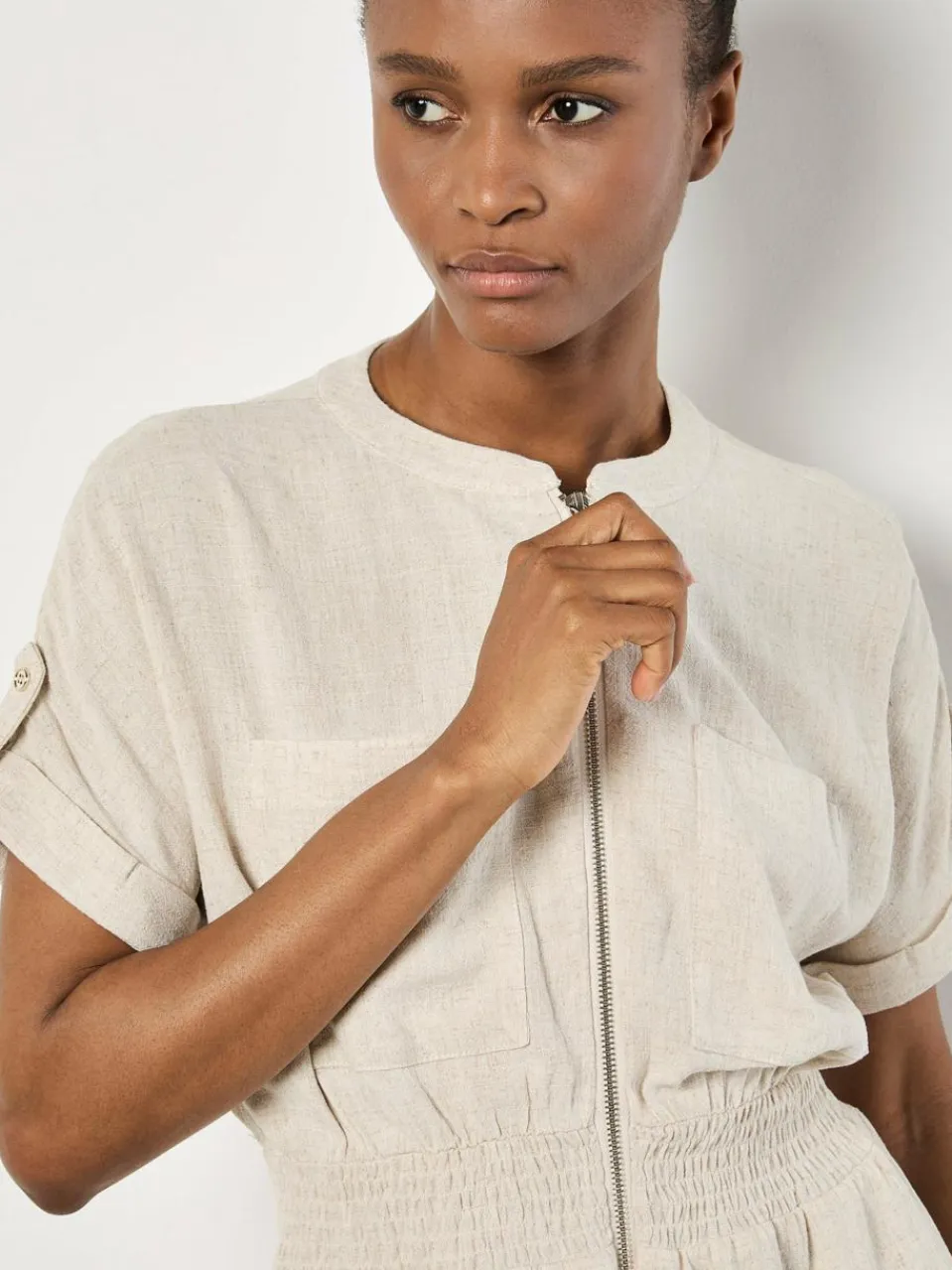 Mit diesem leichten, gewebten Minikleid sind Sie immer gut gekleidet. Es ist aus einer Leinenmischung gefertigt und verfügt über einen durchgehenden Reißverschluss, eine gesmokte Taille für eine schmeichelhafte Passform und zwei aufgesetzte Brusttaschen. Es ist mit gekrempelten Ärmeln und praktischen Seitennahttaschen ausgestattet.