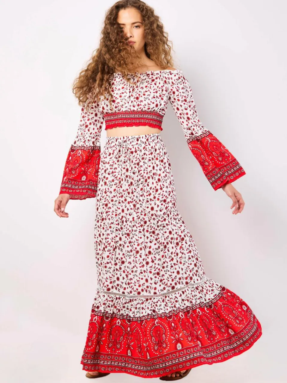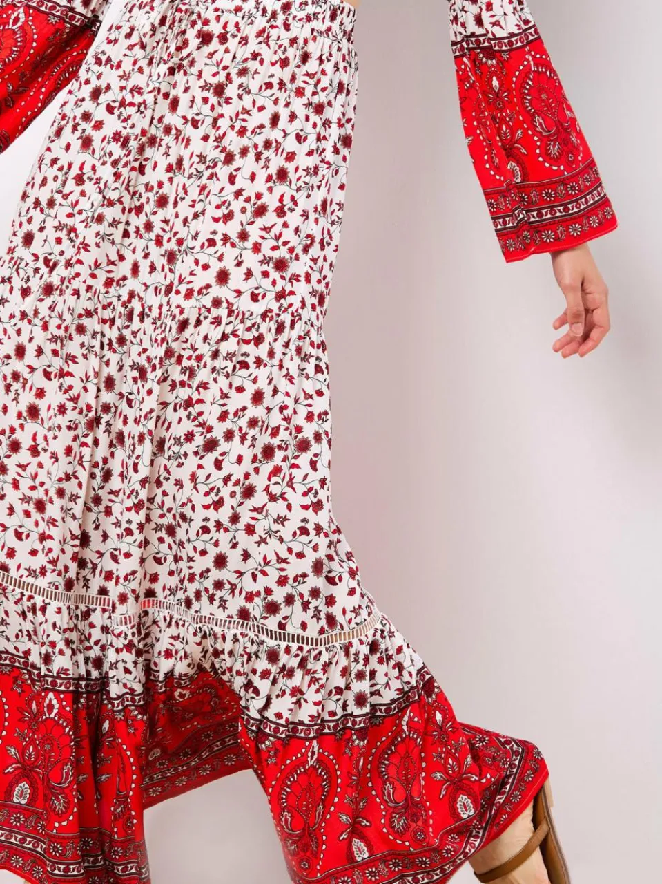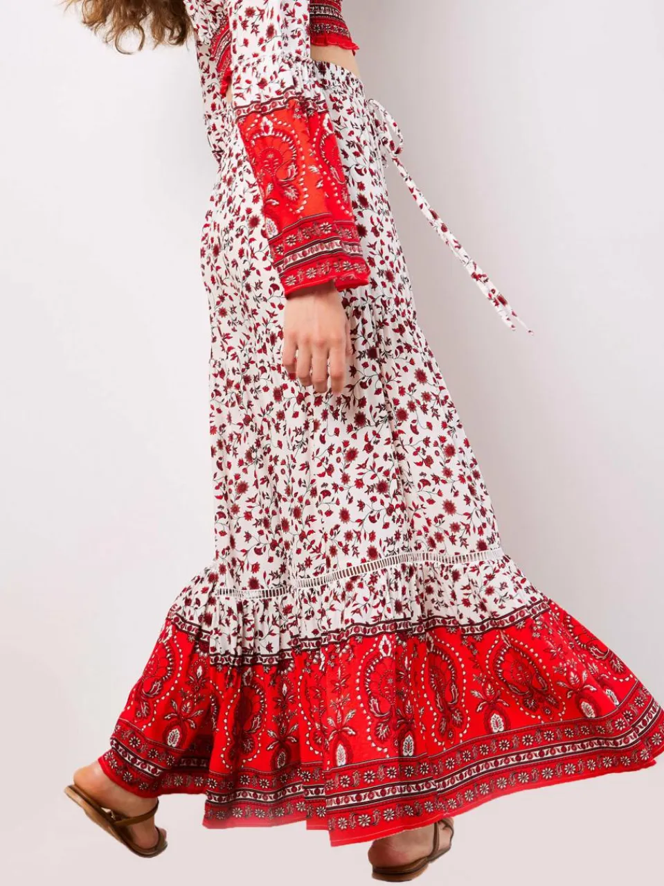 Dieser leichte, gewebte Maxirock hat ein gestuftes Design mit einem hübschen Blumendruck. Der elastische Taillenbund mit Bindeband sorgt für eine bequeme und definierende Passform, während der Einsatz aus Spitze am Saum für ein zusätzliches Highlight sorgt.