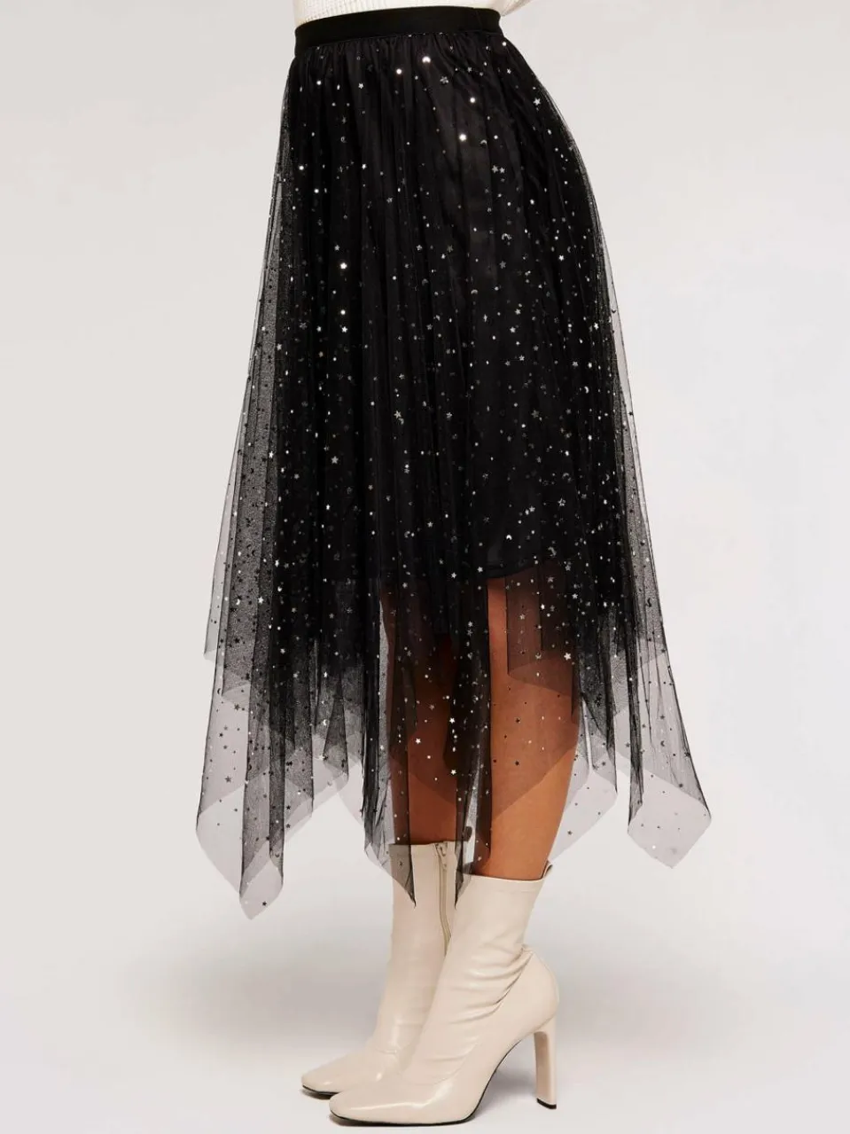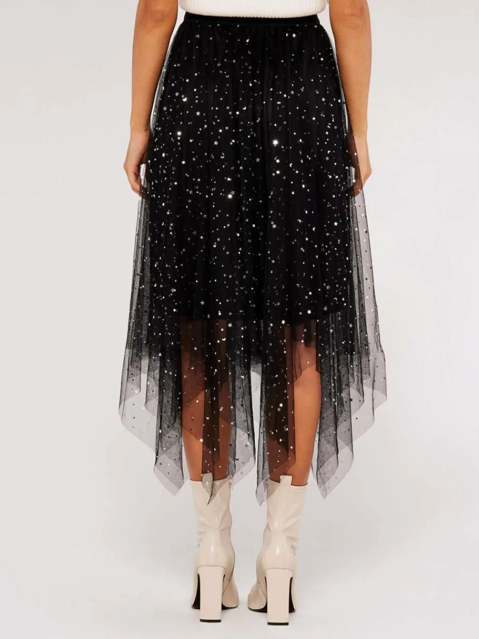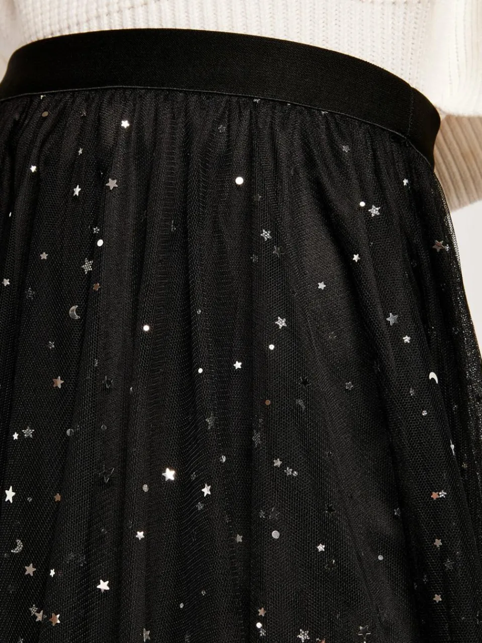 Dieser romantische Midirock aus leichtem Tüll ist gefüttert und mit metallischen Sternen verziert. Der elastische Bund sorgt für eine gute Passform, der Saum ist zipfelig und sorgt für eine verspielte Bewegung.