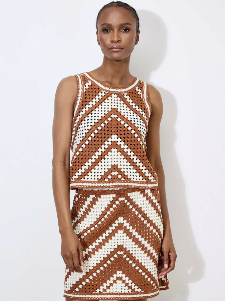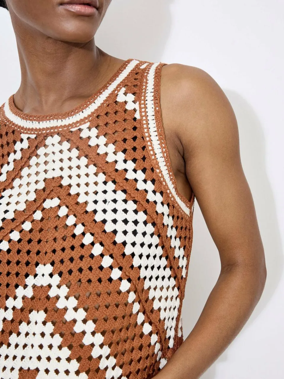 Ergänzen Sie Ihren Wochenendlook mit diesem Chevron-Top im Retro-Look. Es ist aus leichtem Häkelstoff gefertigt und verfügt über einen ärmellosen Schnitt, einen Rundhalsausschnitt und einen Schlüssellochverschluss im Nacken.