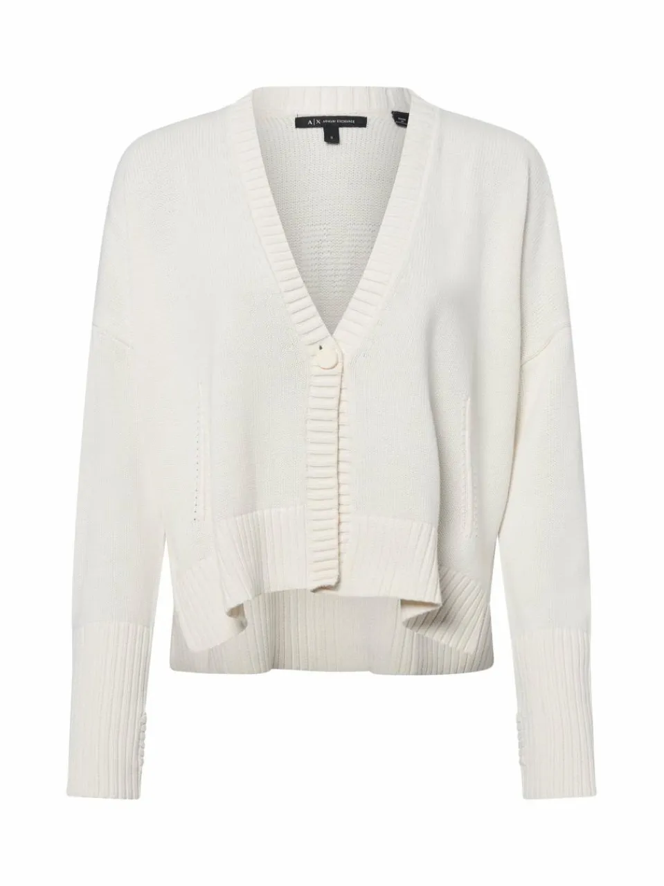 Strickjacke von Armani Exchange aus reiner Baumwolle mit überschnittenen Schultern, langen Ärmeln mit Daumenlöchern und angedeuteten Leistentaschen – Logo-Stickerei auf der Rückseite und kurze Seitenschlitze.