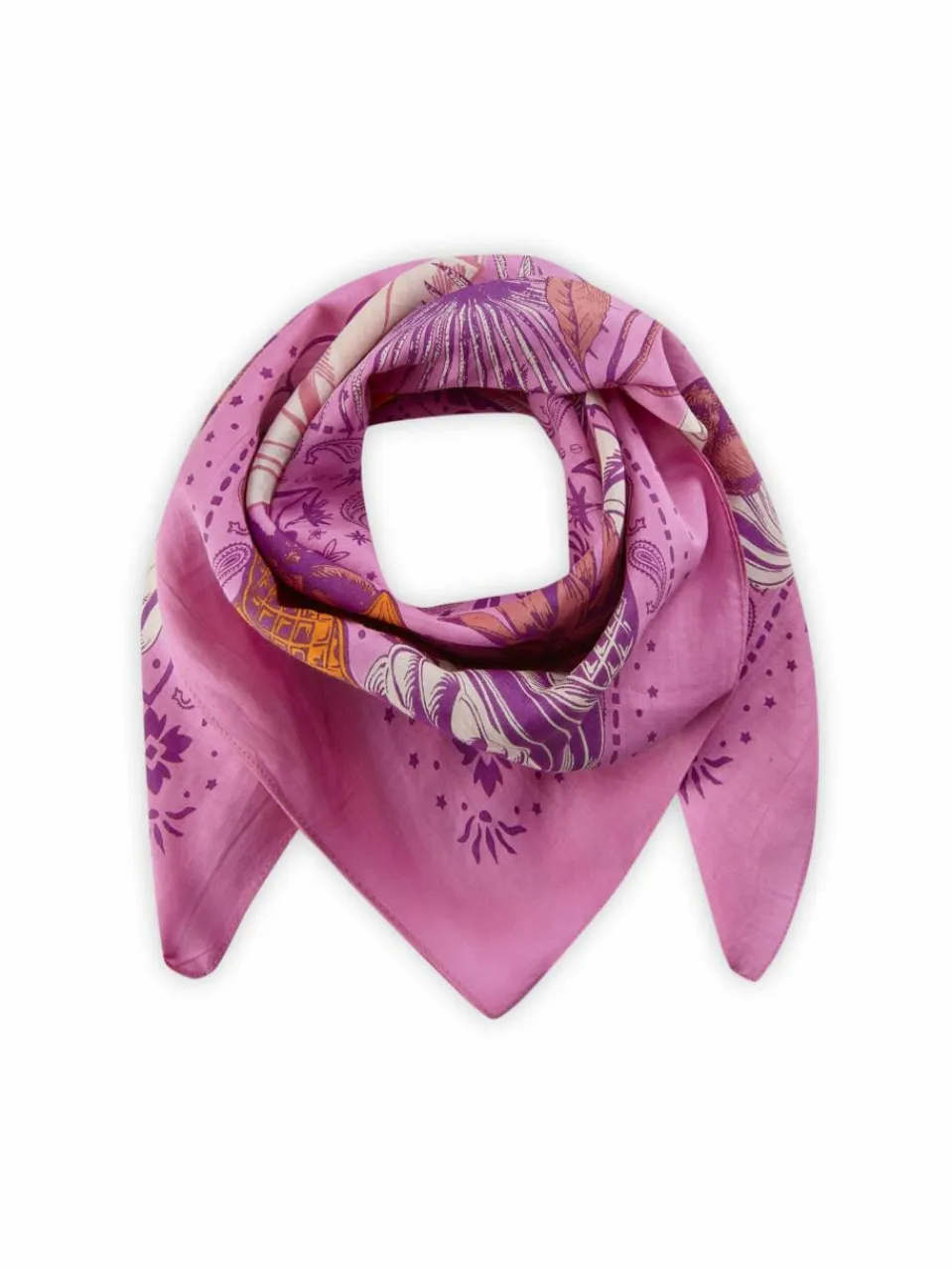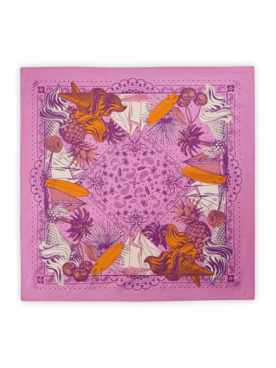 Sommerlich elegant – das perfekte Bandana für den stilvollen Look. Dieses exklusive Carré aus einem edlen Baumwoll-Seide-Mix kombiniert den klassischen Paisley-Print mit verspielten, sommerlichen Symbolen. An den Ecken findest du aufwändig eingearbeitete Motive wie Ananas, Surfbrett, Softeis, Palme und Segelboot – die perfekte Mischung aus Eleganz und fröhlichem Sommerflair.