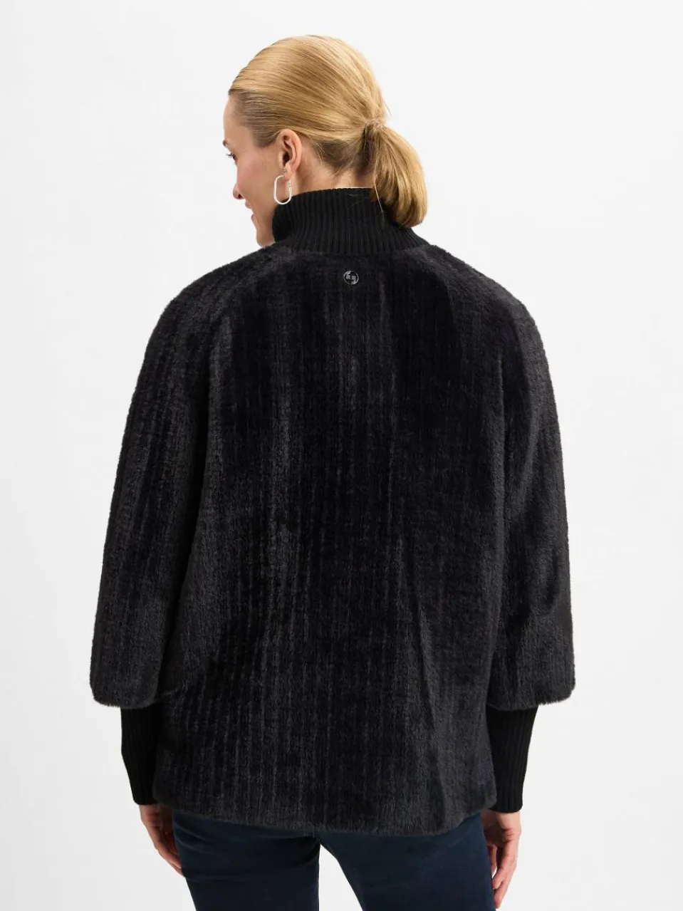 Cool und cozy – so zeigt sich die kuschelweiche Faux-Fur-Jacke von comma mit geripptem Stehkragen und extralangen Ärmelbündchen und rundet den Freizeit-Look exklusiv ab.